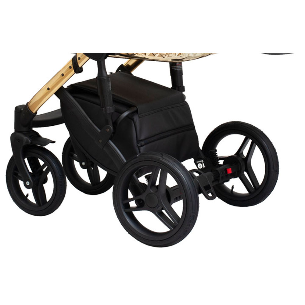 Designerska, wytrzymała konstrukcja wykonana z aluminium z wyciąganymi „ośkami”, dzięki czemu można całkowicie zdemontować wszystkie koła wraz z nimi. Stelaż z wykonanymi bocznymi frezami dostępny w 2 kolorach – srebrno-czarny i złoto-czarny. Łatwy i praktyczny system składania stelaża do małych rozmiarów – do pozycji „0”. 3 pary amortyzatorów z możliwością regulacji twardości zawieszenia, co wpływa na większy komfort jazdy Twojego Dziecka. Przednie koła wyposażone w obrotowy system 360 stopni z funkcją blokady kół do jazdy na wprost oraz systemem „antishock”, który przyjmuje na siebie nierówności terenu podczas jazdy oraz w trakcie zderzenia np. z przeszkodą, dzięki czemu Twoje Dziecko nie odczuwa wstrząsów. Regulowana, obszyta ekoskórą, wysokość rączki w stelażu pozwala na dostosowanie jej poziomu do wzrostu rodzica. Rodzaj kół: NOWOŚĆ żelowo-gumowe. Koła są równie miękkie jak pompowane, zapewniające bardzo wysoki komfort jazdy dla Twojego Dziecka.