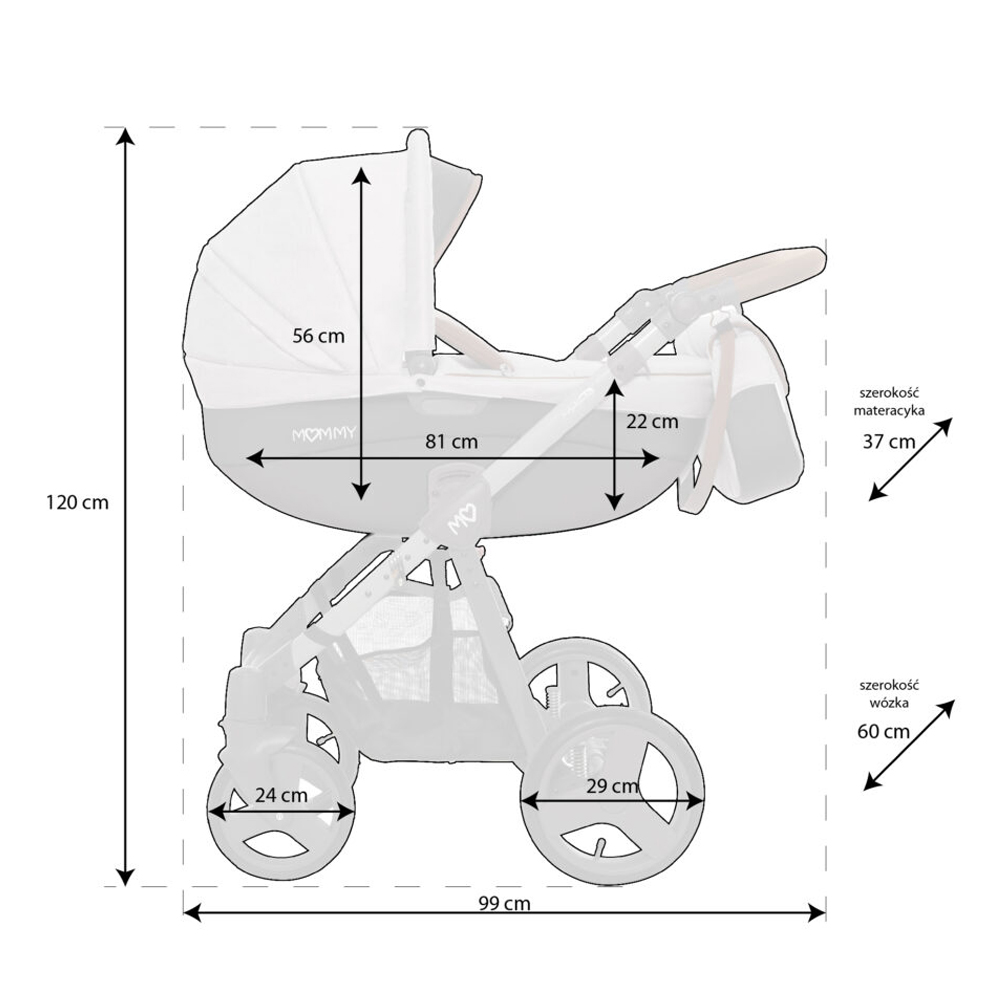 - Wymiary wózka - z gondolą (dł. x szer. x wys.): 99 x 60 x 120 cm,