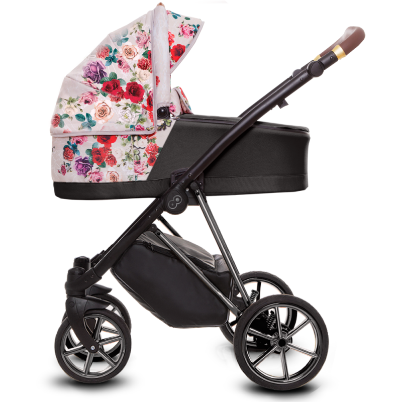 Doskonałe rozwiązanie, które pozwoli Ci idealnie dopasować do siebie kąt nachylenia rączki, dzięki czemu możesz wybrać się nawet na dłuższy spacer nie obawiając się o swoje nadgarstki. Dodatkowo, pokrycie rączki wysokiej jakości ekoskórą sprawia, że jest ona przyjemna w dotyku i łatwo zachować ją w czystości. Przestrzeń pod wózkiem zajmuje przestronny i pakowny, zamykany na suwak, koszyk na zakupy wykonany z materiału odpornego na zabrudzenia. Jeśli nie jest potrzebny da się go łatwo odpiąć. Płynna regulacja amortyzacji wózka pozwoli Ci na spacery wózkiem po trudnym nierównym terenie tak aby dziecko mogło spokojnie podróżować oraz spać.