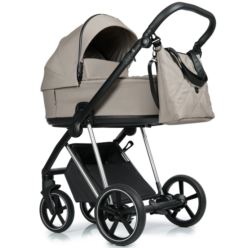 Lekki aluminiowy stelaż, komfortowe zawieszenie. Amortyzator z dwustopniową regulacją twardości, spora rozpiętość regulacji sprawia, że wózek dostosowany jest dobrze do bezdroży jak i gładkich powierzchni. Przednie koła obrotowe z możliwością blokady, system Anti Shock, system stabilizacji kół obrotowych. Bezobsługowe, bezdętkowe koła zapewniają płynne prowadzenie. Centralny hamulec. Szybki i prosty system składania ramy do małych rozmiarów. Możliwość zdjęcia kół z osią, co redukuje szerokość stelaża po złożeniu. Kosz na zakupy z możliwością powiększenia, z szybkim i łatwym dostępem do wnętrza dzięki zapięciom na magnes. Regulowana rączka obszyta eko-skórą. Łatwy i wygodny system „Click” przy montażu gondoli, spacerówki i fotelika.