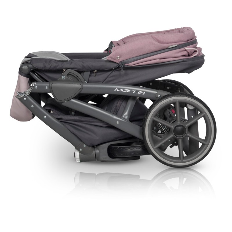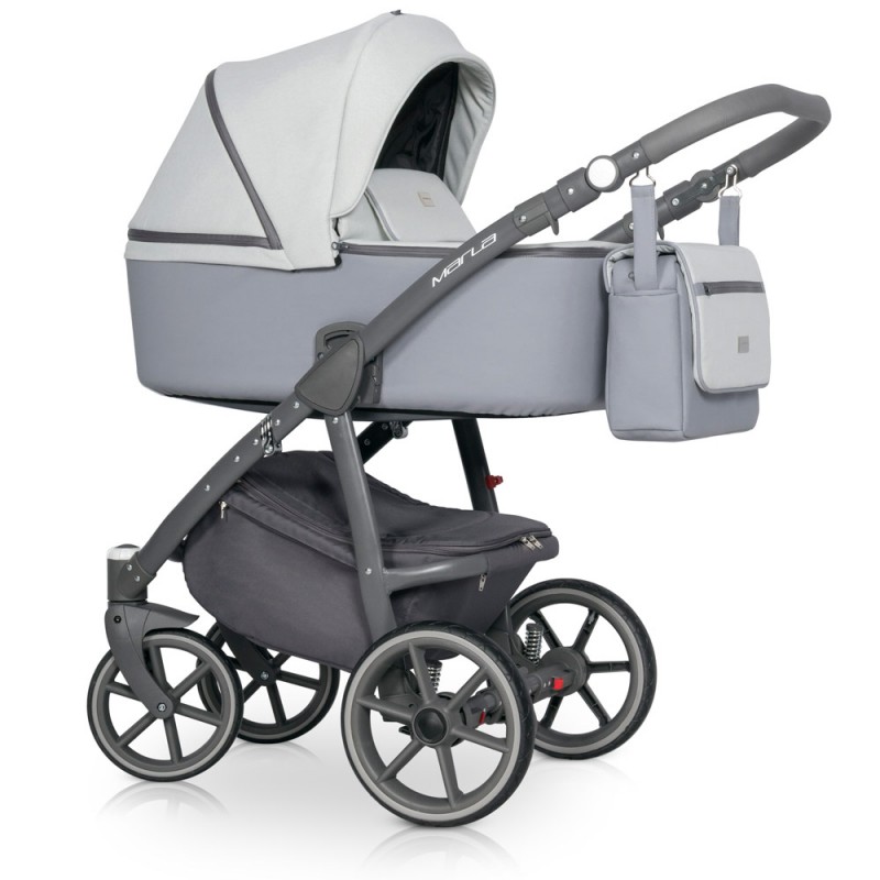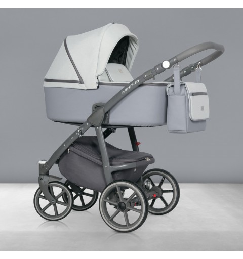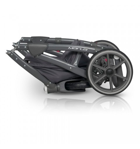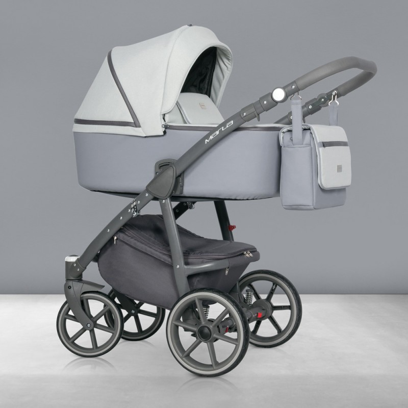 Marla to nowoczesny wózek wielofunkcyjny łączący prostotę formy z ponadprzeciętną funkcjonalnością. Duża gondola z pewnością pomieści Twoje dziecko dopóki nie zacznie korzystać z siedziska spacerowego. Przykrycie gondoli posiada kołnierz mocowany za pomocą magnesów, dzięki czemu nie obudzisz swojej pociechy zaglądając do środka w przeciwieństwie do głośnych rzepów lub nap. MARLA wygodnie składa się razem z siedziskiem spacerowym do małych jak na ten typ wózka rozmiarów. Nowoczesne ultra lekkie koła z bezobsługowymi oponami z poliuretanu nie tylko nadają wózkowi nowoczesnego wyglądu, ale również zapewnią dobrą amortyzację i większą trwałość niż koła pompowane. Tapicerka została wykonana z połączenia skóry ekologicznej i miękkiej tkaniny o strukturze melanżowej w modnych pastelowych kolorach.
