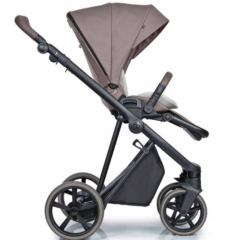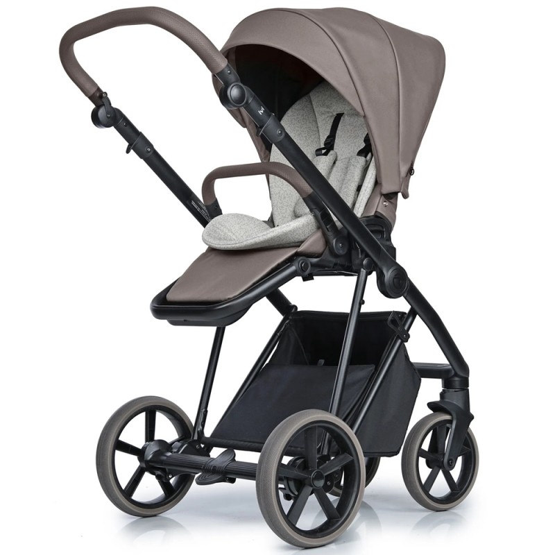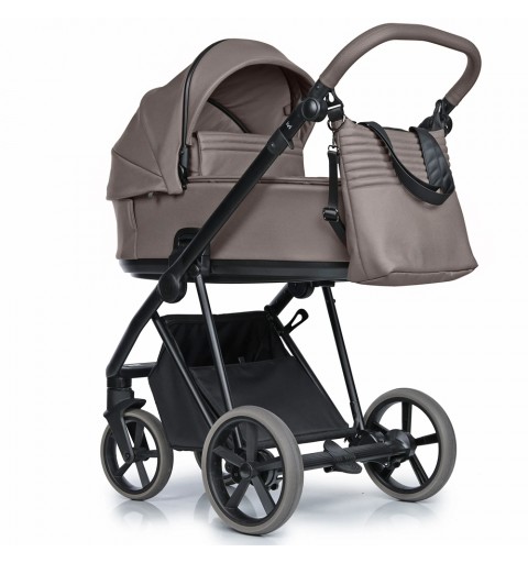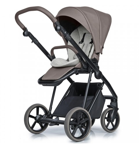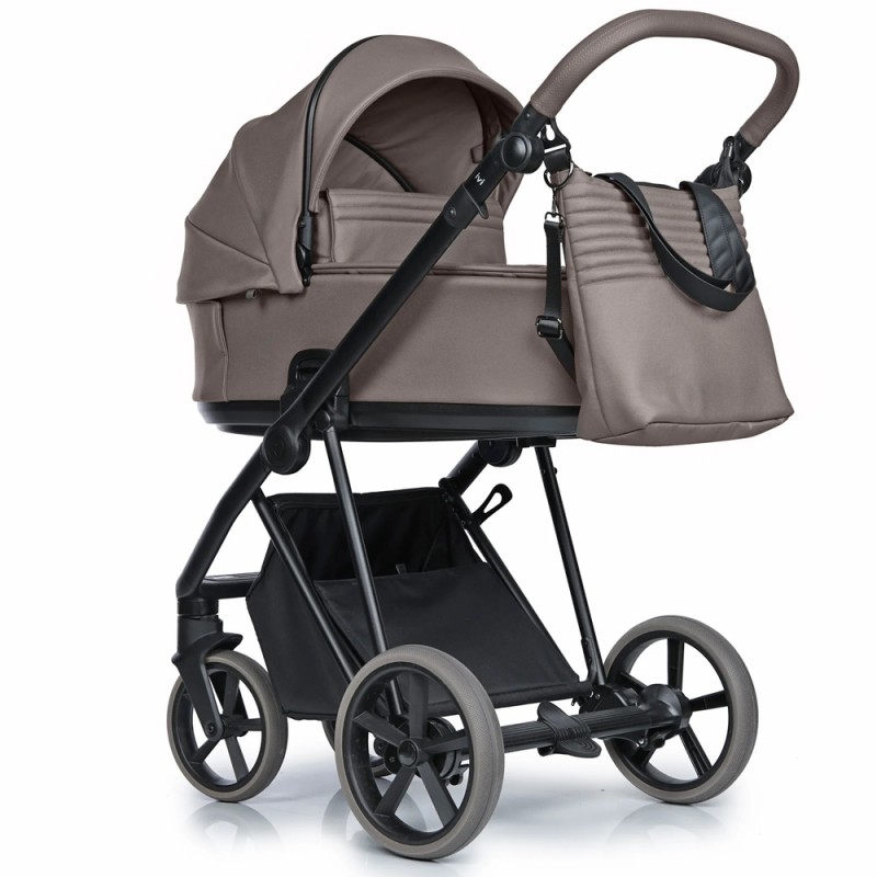 Lekki aluminiowy stelaż, komfortowe zawieszenie. Amortyzator z dwustopniową regulacją twardości, spora rozpiętość regulacji sprawia, że wózek dostosowany jest dobrze do bezdroży jak i gładkich powierzchni. Przednie koła obrotowe z możliwością blokady, system Anti Shock, system stabilizacji kół obrotowych. Bezobsługowe, bezdętkowe koła zapewniają płynne prowadzenie. Centralny hamulec. Szybki i prosty system składania ramy do małych rozmiarów. Możliwość zdjęcia kół z osią, co redukuje szerokość stelaża po złożeniu. Kosz na zakupy z możliwością powiększenia, z szybkim i łatwym dostępem do wnętrza dzięki zapięciom na magnes. Regulowana rączka obszyta eko-skórą. Łatwy i wygodny system „Click” przy montażu gondoli, spacerówki i fotelika.