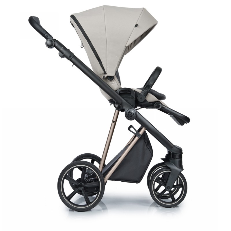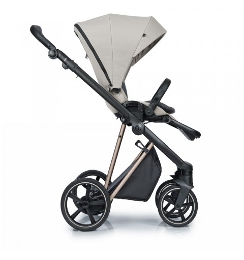Lekki aluminiowy stelaż, komfortowe zawieszenie. Amortyzator z dwustopniową regulacją twardości, spora rozpiętość regulacji sprawia, że wózek dostosowany jest dobrze do bezdroży jak i gładkich powierzchni. Przednie koła obrotowe z możliwością blokady, system Anti Shock, system stabilizacji kół obrotowych. Bezobsługowe, bezdętkowe koła zapewniają płynne prowadzenie. Centralny hamulec. Szybki i prosty system składania ramy do małych rozmiarów. Możliwość zdjęcia kół z osią, co redukuje szerokość stelaża po złożeniu. Kosz na zakupy z możliwością powiększenia, z szybkim i łatwym dostępem do wnętrza dzięki zapięciom na magnes. Regulowana rączka obszyta eko-skórą. Łatwy i wygodny system „Click” przy montażu gondoli, spacerówki i fotelika.