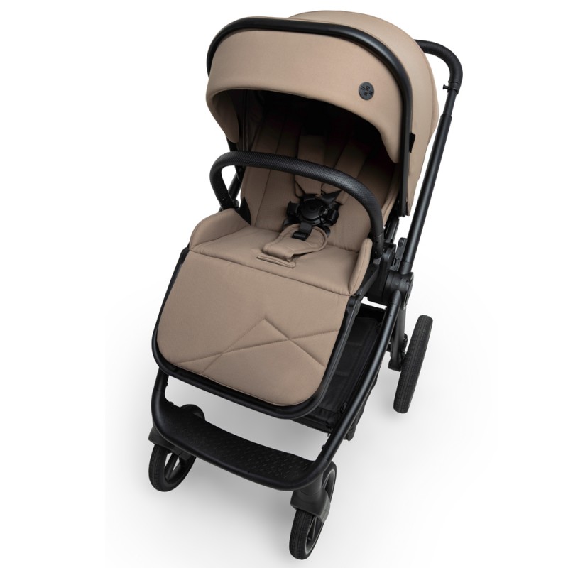 Nowa struktura materiału z hydrofobową powłoką i filtrem UPF50 chroni przed deszczem i słońcem. Wózek wygląda elegancko, a jednocześnie jest praktyczny i łatwy w czyszczeniu.