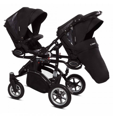 Twinni – to innowacyjny i jedyny w swoim rodzaju wózek specjalnie stworzony dla bliźniąt jak i dwójki dzieci w podobnym wieku. Jest to produkt wytrzymały i bezpieczny. Opatentowana konstrukcja pozwoliła na zmniejszenie gabarytów wózka. W trosce o bezpieczeństwo Waszych pociech wózki zostały wyposażone w system zabezpieczeń pozwalający na utrzymanie kontroli, nawet przy większej gromadce. Dodatkowo Twinny może służyć Państwu jako wózek „rok po roku”, istnieje możliwość wpięcia gondoli razem ze spacerówką(buggy) lub fotelikiem. Ilość kombinacji zależy od Waszych potrzeb. Istotną zaletą jest również możliwość wpinania gondoli, spacerówki i fotelika przodem lub tyłem do kierunku jazdy. Pamiętaj aby przed rozpoczęciem użytkowania zapoznać się z instrukcją obsługi.