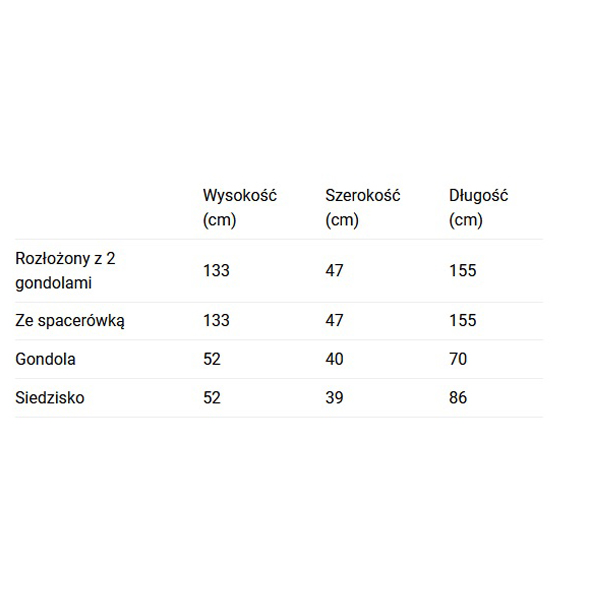 - Wymiary wózka - z gondolą (dł. x szer. x wys.): 155 x 60 x 133 cm,