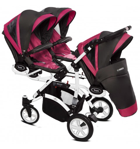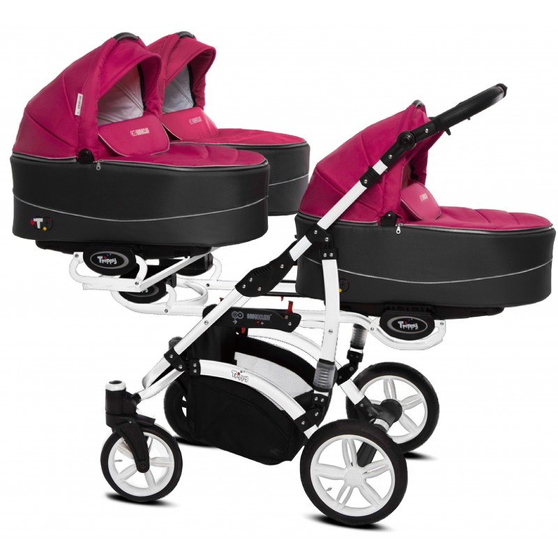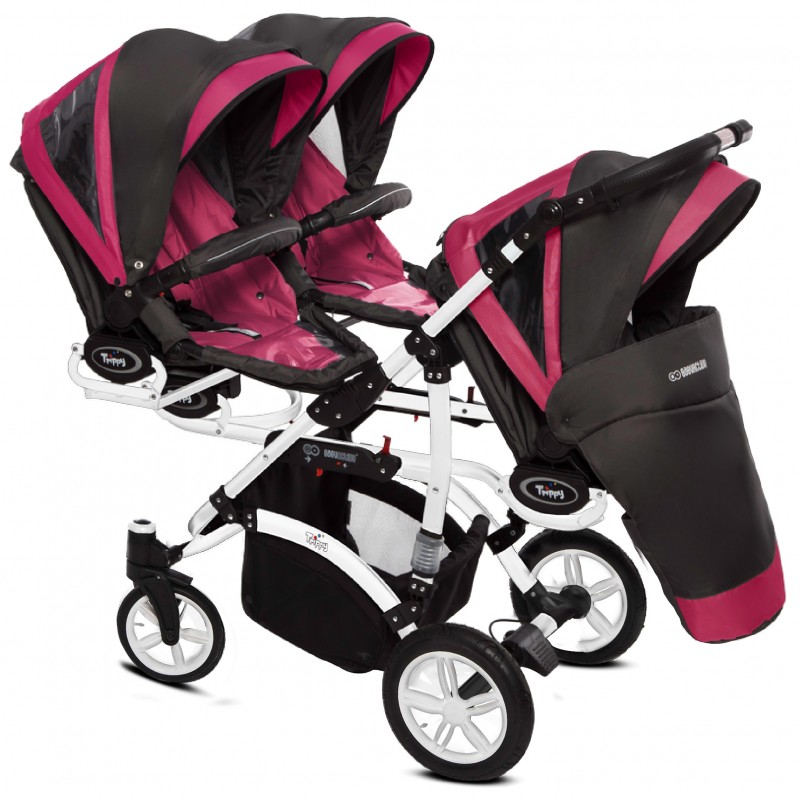 Trippy Premium – to nowa odsłona wózka dla trojaczków. W nowej kolekcji odnajdą Państwo połączenie nowoczesnego wzornictwa z innowacyjnymi rozwiązaniami sprawiającymi, że użytkowanie wózka Trippy Premium jest niezykle komfortowe. Opatentowana konstrukcja pozwoliła na zmniejszenie gabarytów wózka. W trosce o bezpieczeństwo Waszych pociech wózki T&t Premium zostały wyposarzone w system zabiezpieczń pozwalający na utrzymanie kontroli, nawet przy większej gromadce. Dodatkowo Trippy Premium może służyć Państwu jako wózek „rok po roku” , mamy możliwość wpięcia gondoli razem ze spacerówką lub fotelikiem ilość kombinacj zależy od Waszych potrzeb. Istotną zaletą jest również możliwość wpinania gondoli, spacerówki i fotelika przodem lub tyłem do kierunku jazdy.