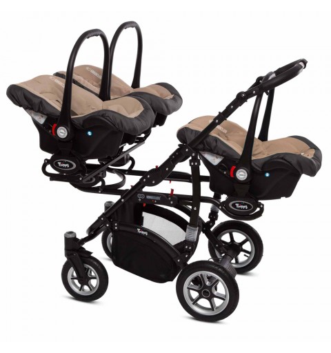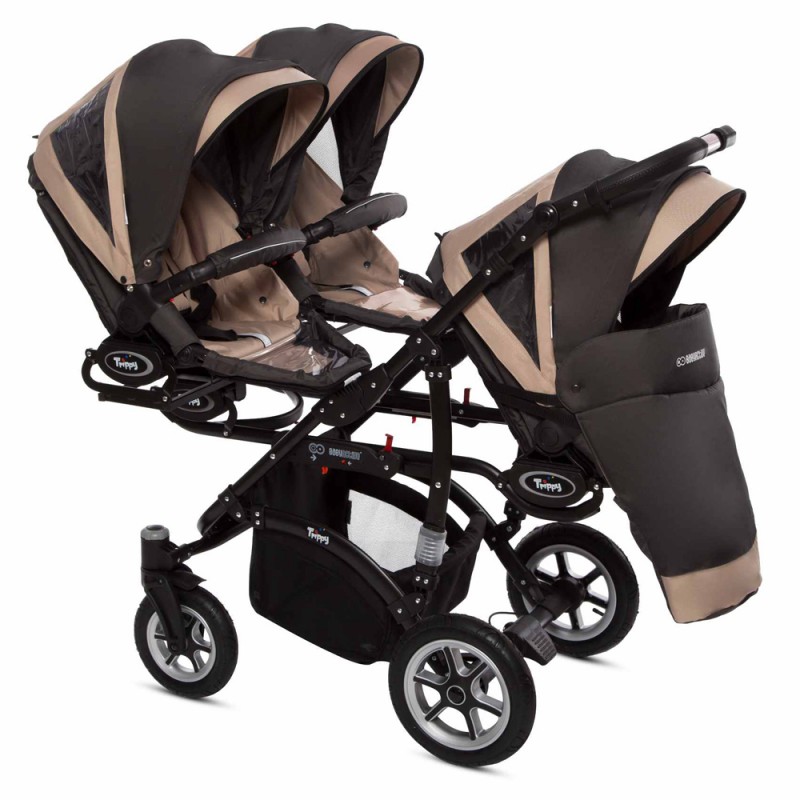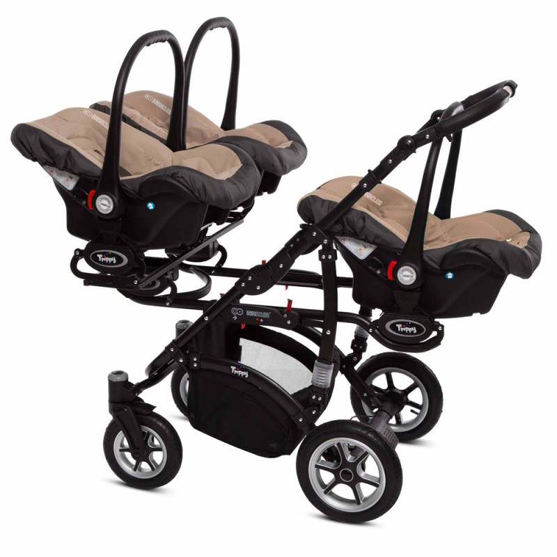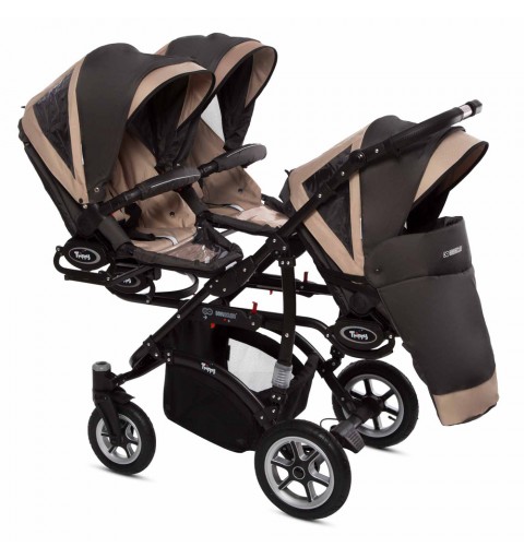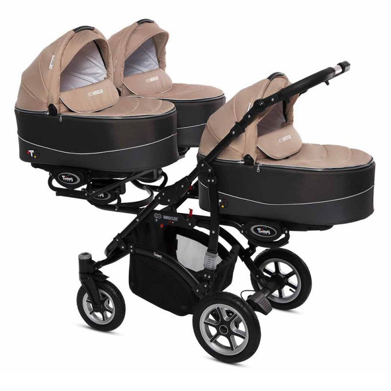 Trippy Premium – to nowa odsłona wózka dla trojaczków. W nowej kolekcji odnajdą Państwo połączenie nowoczesnego wzornictwa z innowacyjnymi rozwiązaniami sprawiającymi, że użytkowanie wózka Trippy Premium jest niezykle komfortowe. Opatentowana konstrukcja pozwoliła na zmniejszenie gabarytów wózka. W trosce o bezpieczeństwo Waszych pociech wózki T&t Premium zostały wyposarzone w system zabiezpieczń pozwalający na utrzymanie kontroli, nawet przy większej gromadce. Dodatkowo Trippy Premium może służyć Państwu jako wózek „rok po roku” , mamy możliwość wpięcia gondoli razem ze spacerówką lub fotelikiem ilość kombinacj zależy od Waszych potrzeb. Istotną zaletą jest również możliwość wpinania gondoli, spacerówki i fotelika przodem lub tyłem do kierunku jazdy.