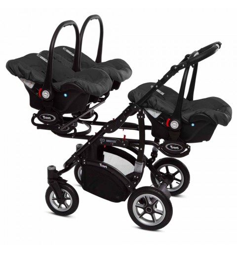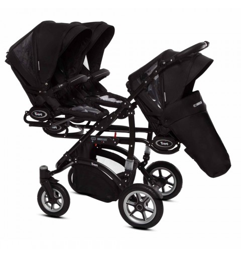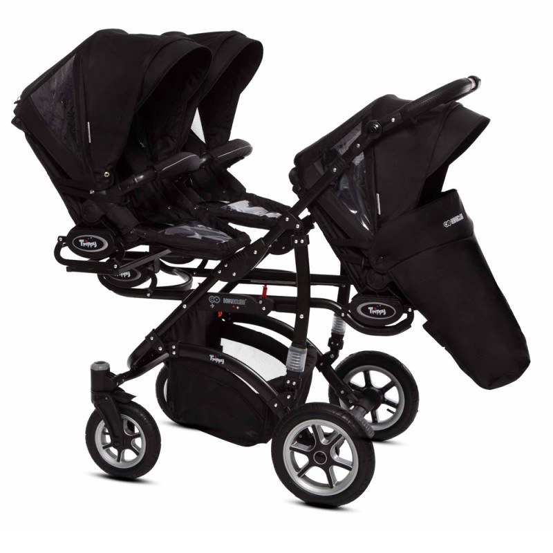 Trippy Premium – to nowa odsłona wózka dla trojaczków. W nowej kolekcji odnajdą Państwo połączenie nowoczesnego wzornictwa z innowacyjnymi rozwiązaniami sprawiającymi, że użytkowanie wózka Trippy Premium jest niezykle komfortowe. Opatentowana konstrukcja pozwoliła na zmniejszenie gabarytów wózka. W trosce o bezpieczeństwo Waszych pociech wózki T&t Premium zostały wyposarzone w system zabiezpieczń pozwalający na utrzymanie kontroli, nawet przy większej gromadce. Dodatkowo Trippy Premium może służyć Państwu jako wózek „rok po roku” , mamy możliwość wpięcia gondoli razem ze spacerówką lub fotelikiem ilość kombinacj zależy od Waszych potrzeb. Istotną zaletą jest również możliwość wpinania gondoli, spacerówki i fotelika przodem lub tyłem do kierunku jazdy.