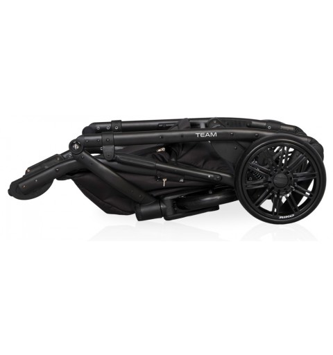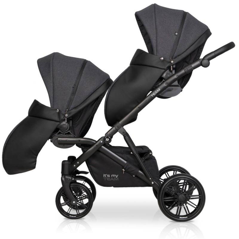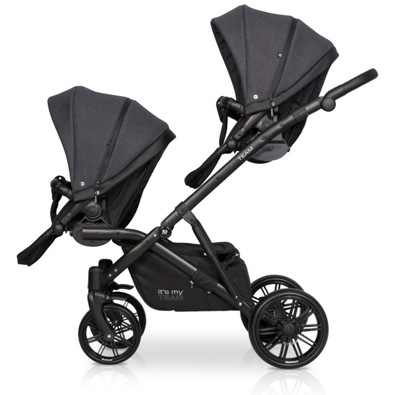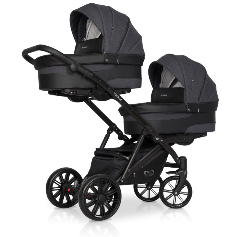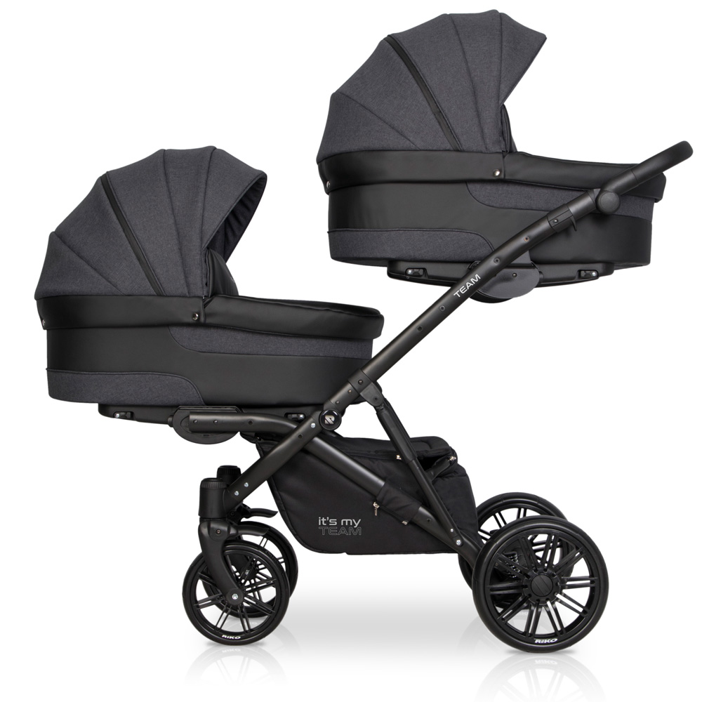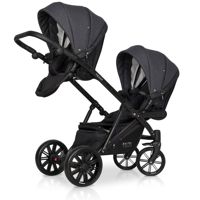 TEAM marki RIKO to nowoczesny wózek dla bliźniąt lub dzieci rok po roku typu tandem. Szerokość wózka pozwala bez problemu przejechać przez każde drzwi bez konieczności składania stelaża lub wypinania modułów. TEAM charakteryzuje się doskonałą amortyzacją. Tylne zawieszenie oraz dodatkowe amortyzatory znajdujące się w środkowej części wózka posiadają dwustopniową regulację twardości. Funkcja ta jest niezwykle ważna przy wózku dla dwójki dzieci, ponieważ obciążenie jest o wiele większe niż w wózkach pojedynczych. Inaczej również rozkłada się środek ciężkości. TEAM jest produktem polskim wyprodukowanym zgodnie z europejską normą bezpieczeństwa PN-EN 1888:2012. Obecna wersja jest nową udoskonaloną generacją swojego poprzednika, który był dostępny na rynku od początku 2018 roku. Nowy TEAM posiada powiększone siedziska spacerowe, zupełnie nowy stelaż zapewniający lepsze wyważenie i dodatkową amortyzację oraz nowocześniejsze komponenty poprawiające zarówno funkcjonalność jak i wytrzymałość wózka.