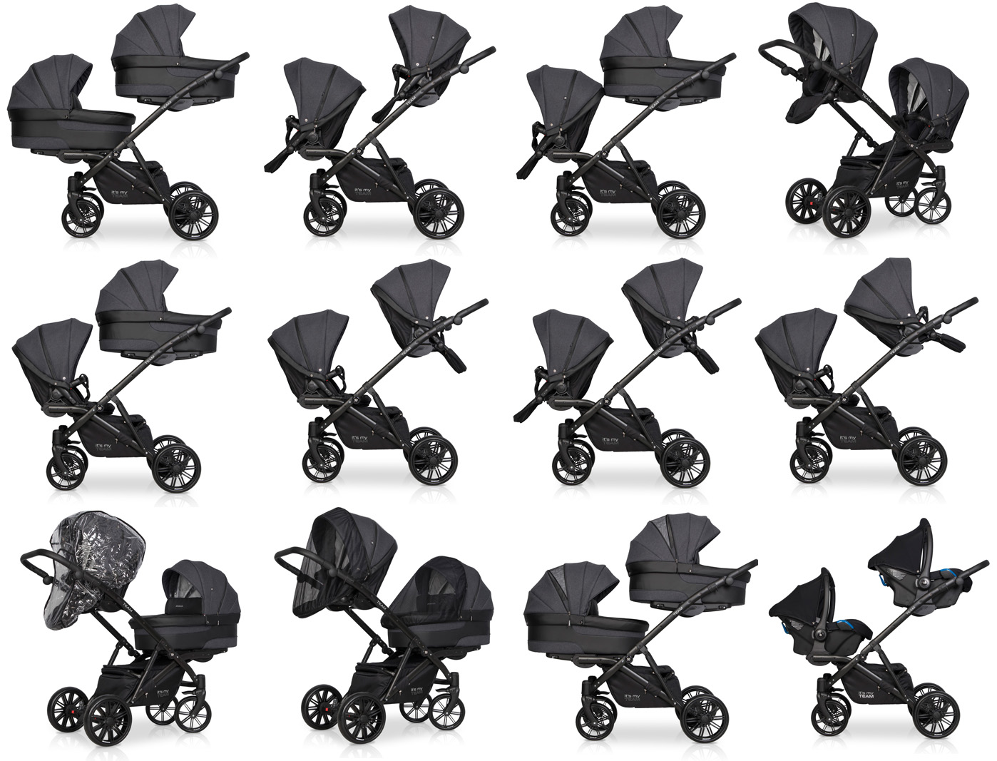 - Wielofunkcyjny wózek dla bliźniąt lub dla dzieci rok po roku typu tandem,