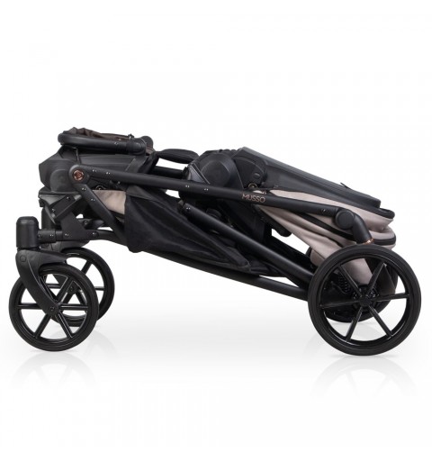Wózek RIKO MUSSO przeznaczony dla dwóch dzieci można złożyć wraz z oboma siedziskami do stosunkowo małych rozmiarów jak na tę klasę wózków. Dodatkowo, jego waga jest zaskakująco niska jak na podwójny wózek w układzie tandemowym. Cała rama wózka, łącznie z kołami, waży jedynie 9,5 kg, co jest świetnym osiągnięciem. Siedziska składające się „na kanapkę” oraz gondole, które można złożyć na płasko, ułatwiają załadunek wózka do bagażnika samochodu.