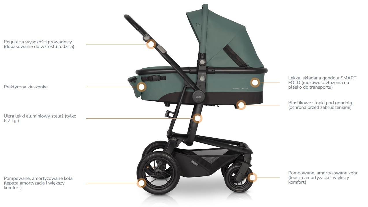 SOUL w wersji z samą gondolę waży zaledwie 10,5 kg mimo, że jest to wózek z pompowanymi kołami. Jest to jeden z najlepszych wyników na rynku. Stelaż wózka SOUL waży zaledwie 6,7 kg i składa się do niezwykle małych rozmiarów (najmniejszy stelaż po złożeniu w ofercie marki EASYGO). Gondola posiada funkcję SMART FOLD, więc bez problemu złożysz ją na płasko na przykład na czas przewożenia samochodem, gdy dziecko przebywa w foteliku. Waga gondoli to zaledwie 3,8 kg. W późniejszym czasie istnieje możliwość dokupienia siedziska spacerówki. Spacerówkę można zamontować zarówno przodem jak i tyłem do kierunku jazdy (przekładane siedzisko). Oparcie można ustawić w jednej z 3 pozycji: leżącej, półleżącej i w pełni siedzącej. Podnóżek regulowany jest w dwóch pozycjach: leżącej i siedzącej. Duża budka przeciwsłoneczna z ukrytą dodatkową sekcją i daszkiem przeciwsłonecznym idealnie sprawdzi się w każdych warunkach. W zestawie z siedziskiem znajduje się przykrycie na nóżki oraz pełna folia przeciwdeszczowa z zamykanym okienkiem wentylacyjnym, które pozwala na pozostawienie foli na wózku do czasu całkowitego wyschnięcia.