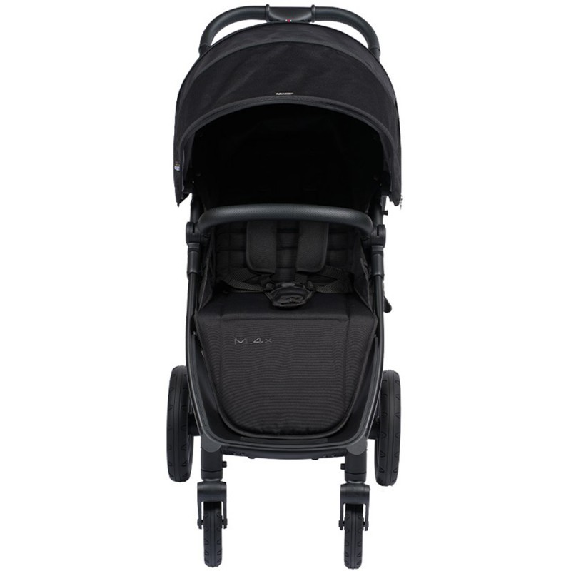 Aby jak najlepiej zabezpieczyć dziecko, a także szybko zapiąć w siedzisku, M.4x posiada 5-punktowy system bezpieczeństwa i bezstopniowo regulowane szelki, które można regulować jedną ręką. Obrotowy pałąk bezpieczeństwa po obu stronach można całkowicie zdjąć, aby zainstalować gondole (bez adapterów) lub fotelik samochodowy (z adapterami).
