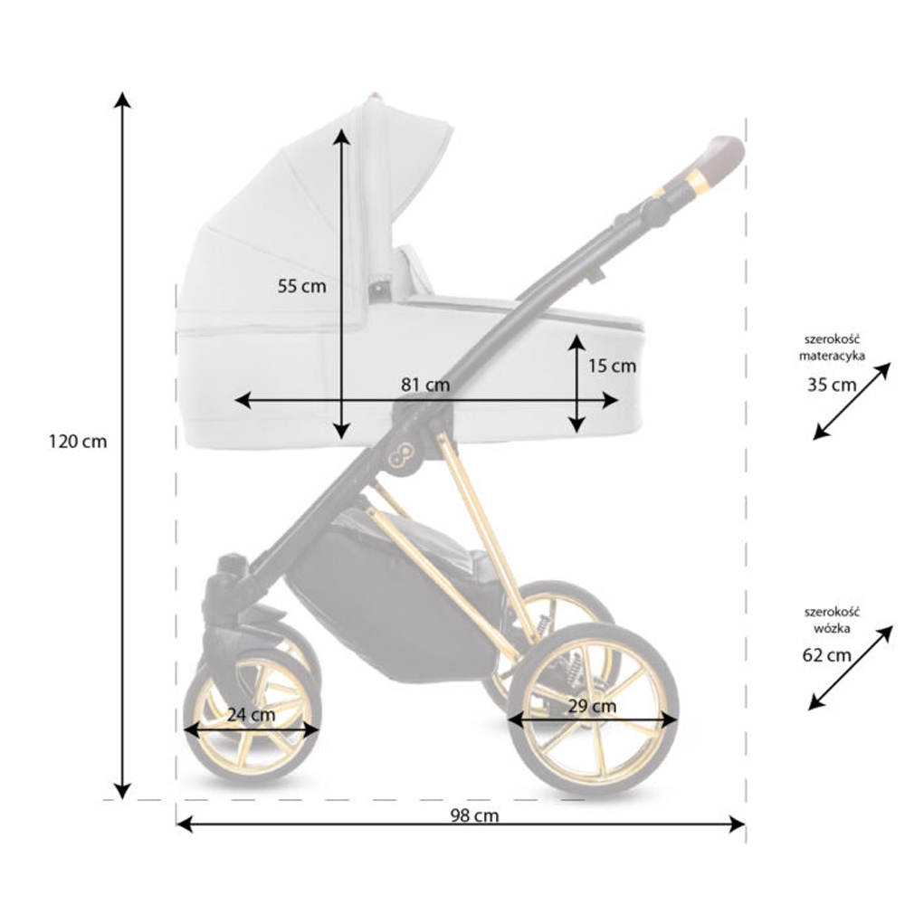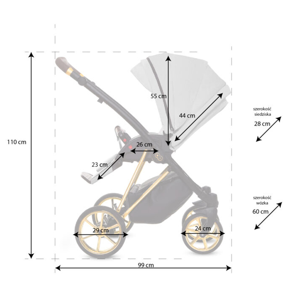 - Wymiary wózka - z siedziskiem (dł. x szer. x wys.): 99 x 62 x 110 cm.