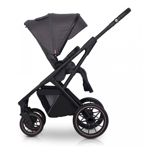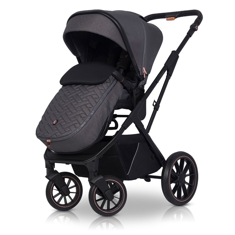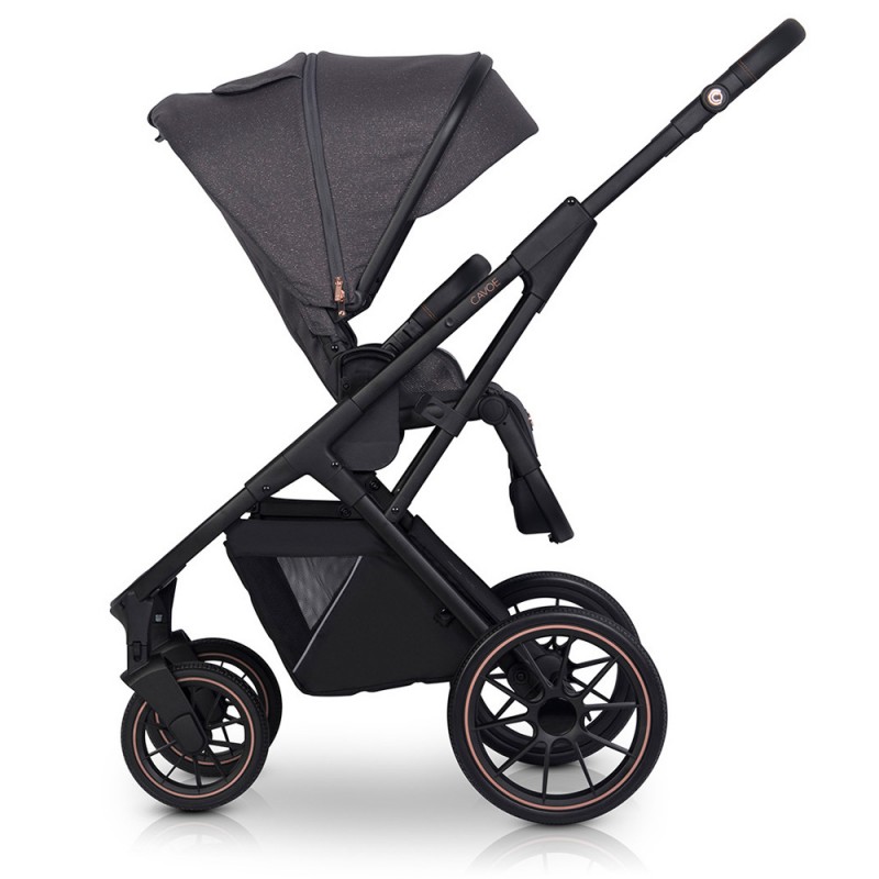 Wózek AXO SHINE podobnie jak popularna kolekcja STYLE posiada regulację wysokości prowadnicy. Funkcja ta umożliwia wygodne prowadzenie wózka zarówno wysokim jak i niskim rodzicom. Przyciski regulacji zostały udekorowane eleganckimi metalowymi sygnetami CAVOE w kolorze ROSE GOLD, dzięki czemu ta niezwykle praktyczna funkcja stała się również dekoracją wózka.