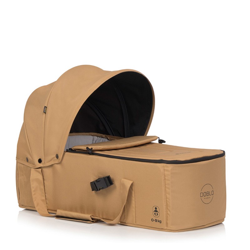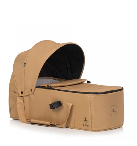 Gondolę montuje się na rozłożonym na płasko siedzisku wózka za pomocą systemu zapięć. Gondola do wózka DOBLO posiada aż 2 niezależne systemy mocowań: karabińczyki oraz taśmy zaciskowe. Dzięki nim, gondola jest pewnie osadzona w wózku i gwarantuje bezpieczeństwo dziecku.