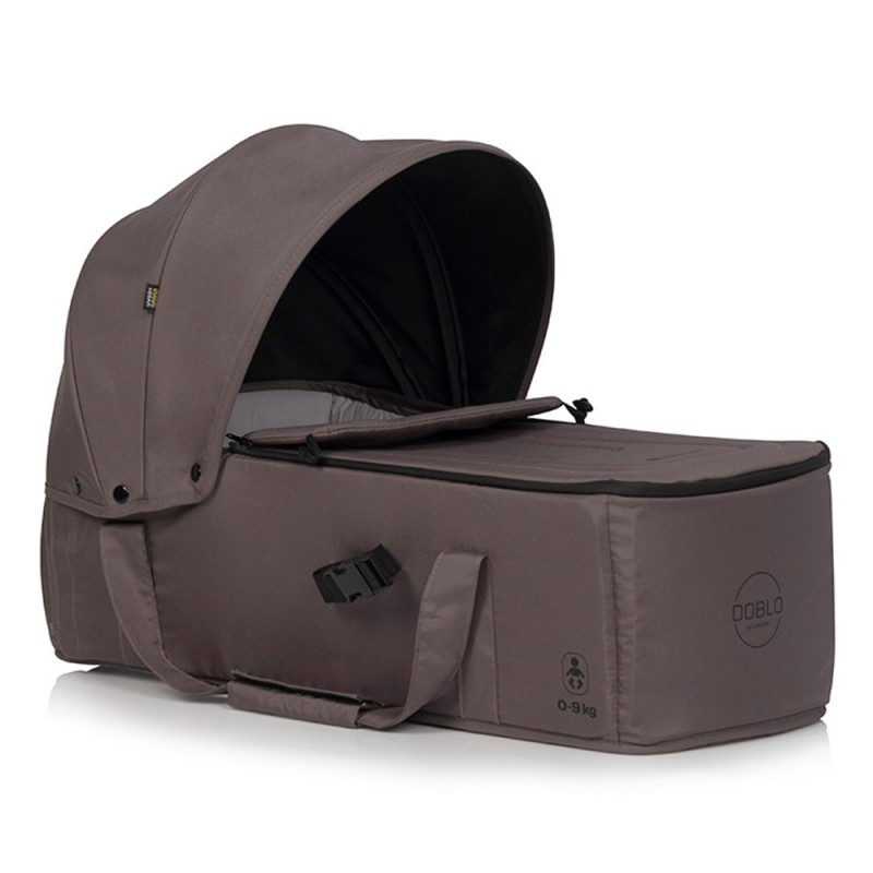 Gondolę montuje się na rozłożonym na płasko siedzisku wózka za pomocą systemu zapięć. Gondola do wózka DOBLO posiada aż 2 niezależne systemy mocowań: karabińczyki oraz taśmy zaciskowe. Dzięki nim, gondola jest pewnie osadzona w wózku i gwarantuje bezpieczeństwo dziecku.