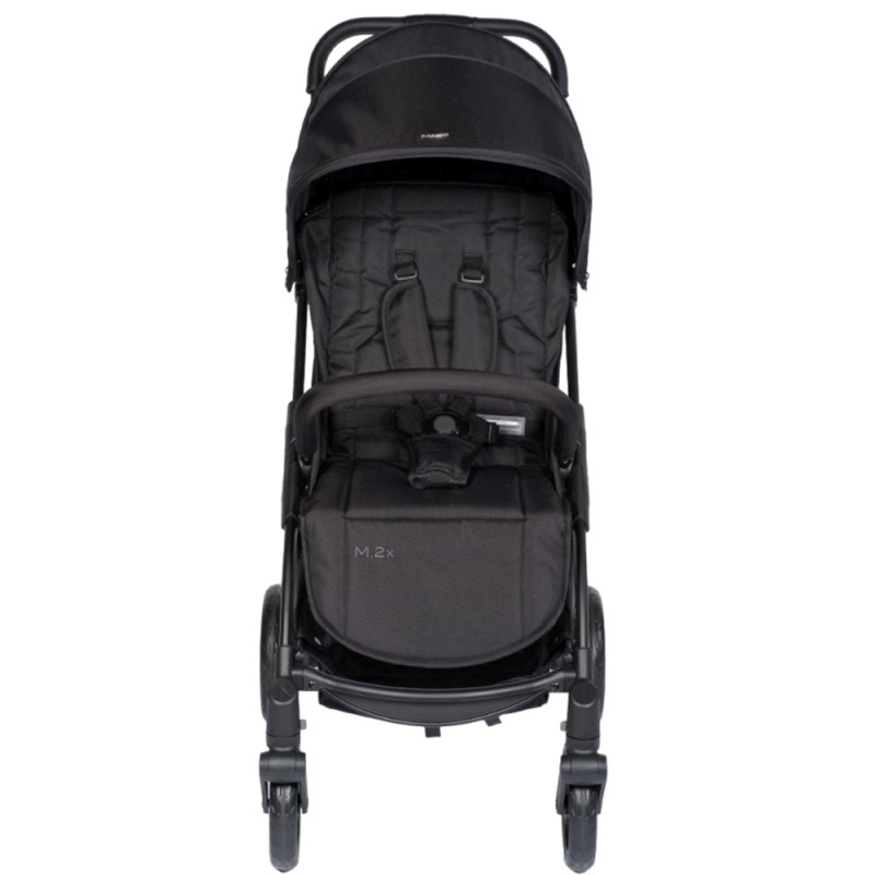 Dzięki regulowanej pięciopunktowej uprzęży M.2x bez ponownego nawlekania, możesz łatwo dostosować paski, aby zapiąć dziecko w wózku. Pałąk bezpieczeństwa można odłączyć, aby zainstalować gondolę M.2x lub specjalne adaptery do fotelika samochodowego.