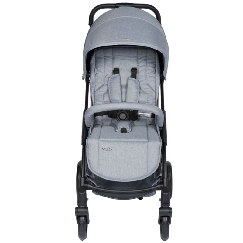 Dzięki regulowanej pięciopunktowej uprzęży M.2x bez ponownego nawlekania, możesz łatwo dostosować paski, aby zapiąć dziecko w wózku. Pałąk bezpieczeństwa można odłączyć, aby zainstalować gondolę M.2x lub specjalne adaptery do fotelika samochodowego.