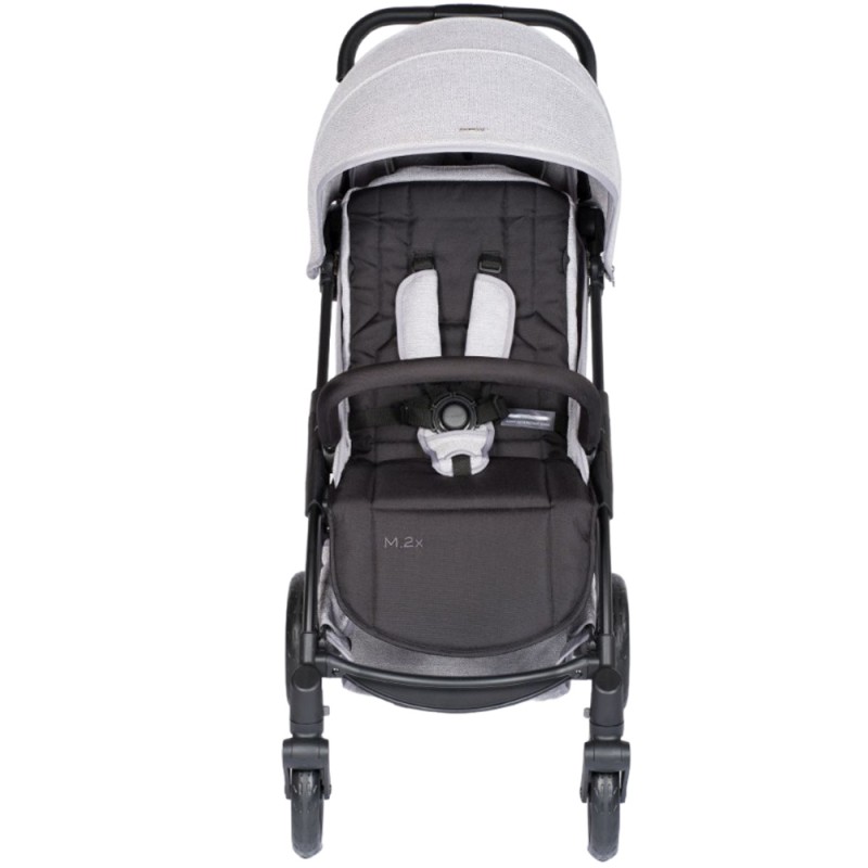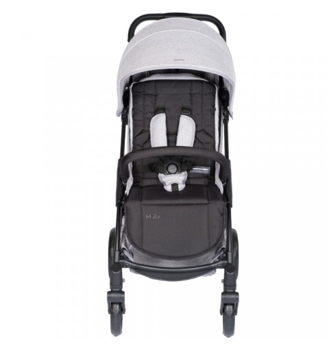 Dzięki regulowanej pięciopunktowej uprzęży M.2x bez ponownego nawlekania, możesz łatwo dostosować paski, aby zapiąć dziecko w wózku. Pałąk bezpieczeństwa można odłączyć, aby zainstalować gondolę M.2x lub specjalne adaptery do fotelika samochodowego.