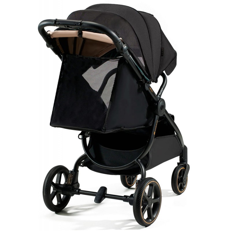 Z MITZY niestraszna Wam będzie niepogoda: duża, wodoodporna budka ma filtr UPF50+, który dodatkowo chroni malca przed promieniami UV. Ma także panel wentylacyjny, zapewniający przewiew podczas upałów, oraz okienko do kontaktu z dzieckiem..