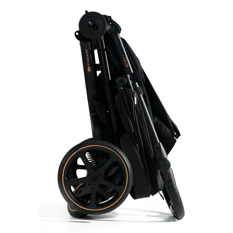 MITZY złożysz jedną ręką do kompaktowych rozmiarów, by wziąć spacerówkę ze sobą w podróż. System składania do wewnątrz chroni materiał siedziska przed zabrudzeniami podczas transportu.