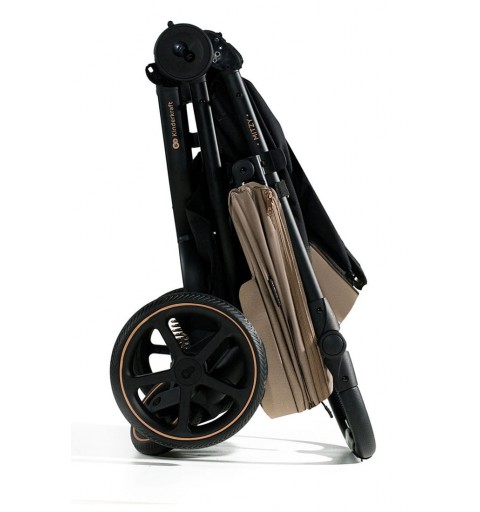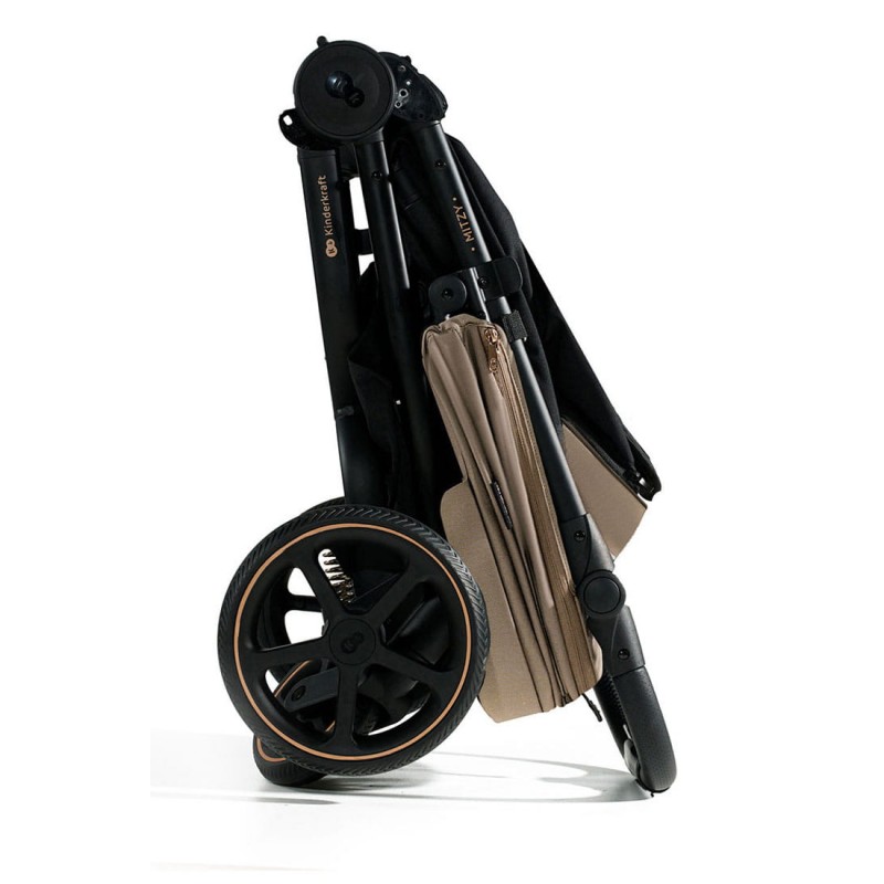 MITZY złożysz jedną ręką do kompaktowych rozmiarów, by wziąć spacerówkę ze sobą w podróż. System składania do wewnątrz chroni materiał siedziska przed zabrudzeniami podczas transportu.