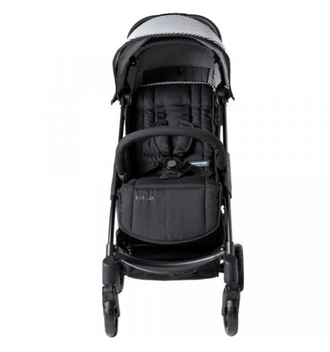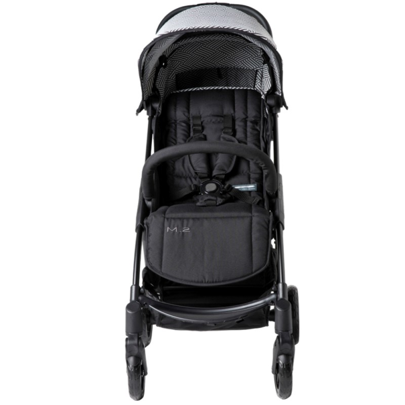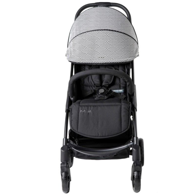 Dzięki regulowanej pięciopunktowej uprzęży M.2, możesz łatwo dostosować paski, aby zapiąć dziecko w wózku. Pałąk bezpieczeństwa można odłączyć, aby zainstalować gondolę M.2 lub specjalne adaptery do fotelika samochodowego. *