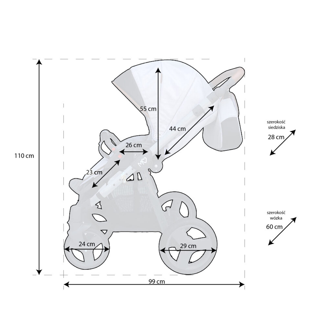 - Wymiary wózka - z siedziskiem (dł. x szer. x wys.): 99 x 60 x 110 cm.