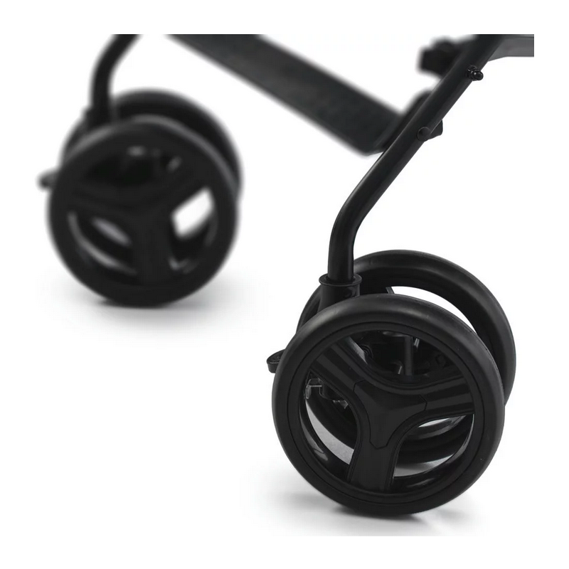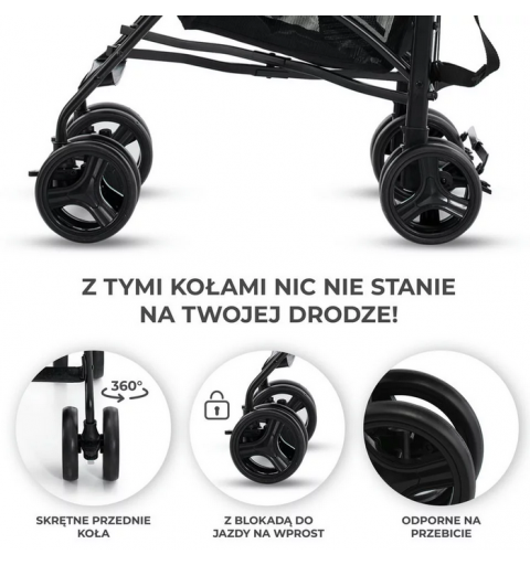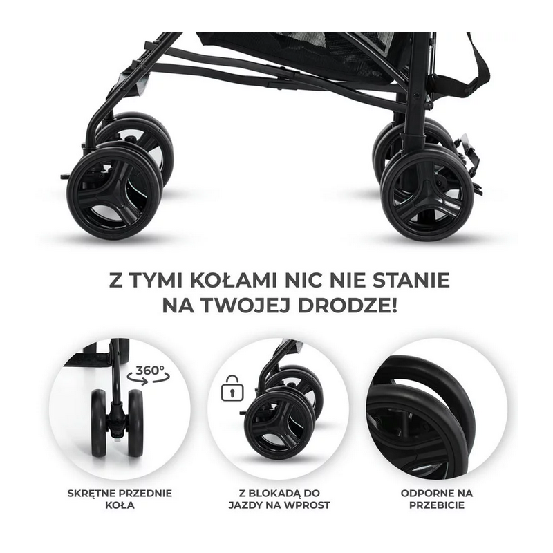 Koła spacerówki są lekkie i nieprzebijalne, a co najważniejsze: nie musisz ich pompować. Świetnie poradzą sobie z nierówną nawierzchnią, szczególnie gdy zablokujesz przednie koła do jazdy na wprost.