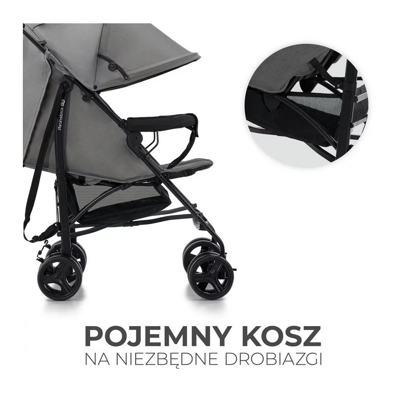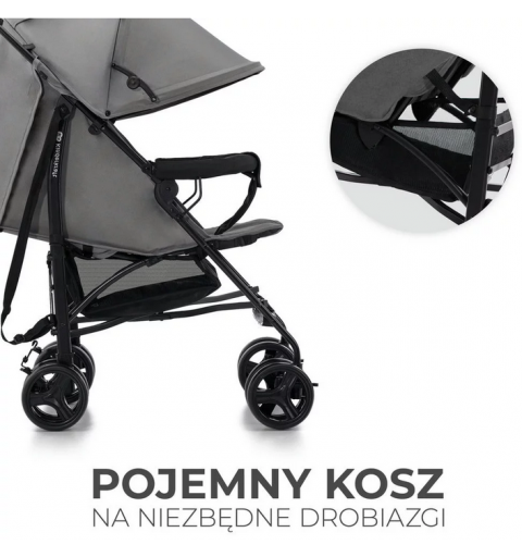 Pod siedziskiem znajduje się pojemny kosz z łatwym dostępem. Zmieścisz tam zarówno niewielkie zakupy, jak i potrzebne podczas spaceru akcesoria, takie jak mokre chusteczki czy pieluszki tetrowe lub zabawki.