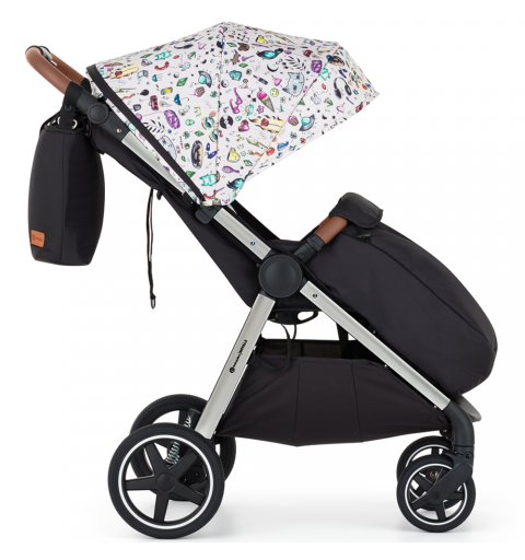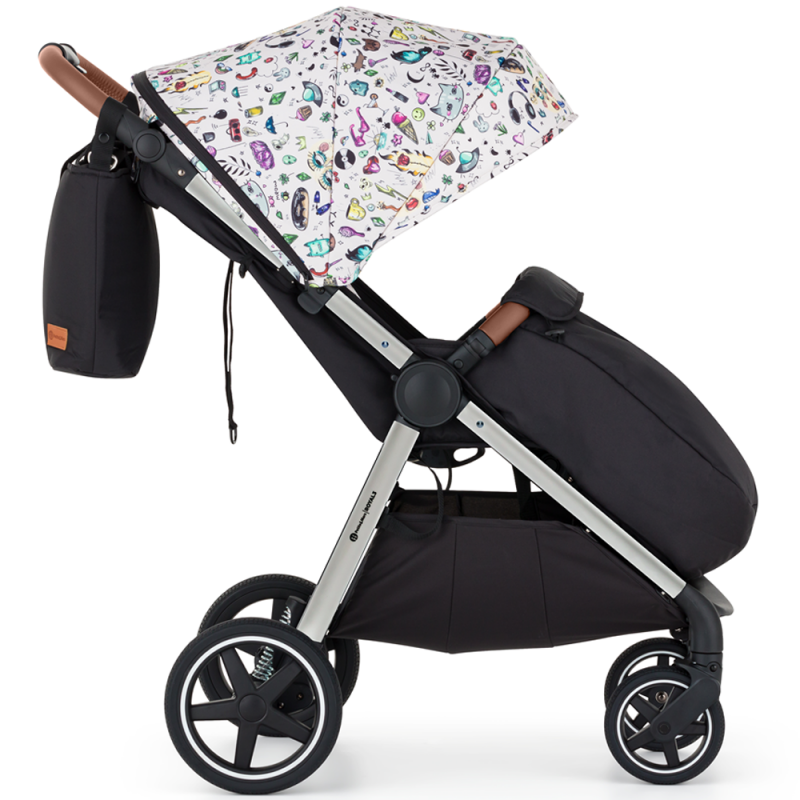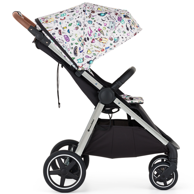Płynnie regulowana rączka pozwala na idealne dopasowanie do wzrostu każdego rodzica. Obszyta jest elegancką elo-skórą co gwarantuje nam pewny chwyt oraz łatwość w utrzymaniu czystości. W rączce umieszczony został mechanizm do składania całego wózka do niewielkich rozmiarów. Dzięki temu wózek możemy złożyć na pomocą jednej ręki.