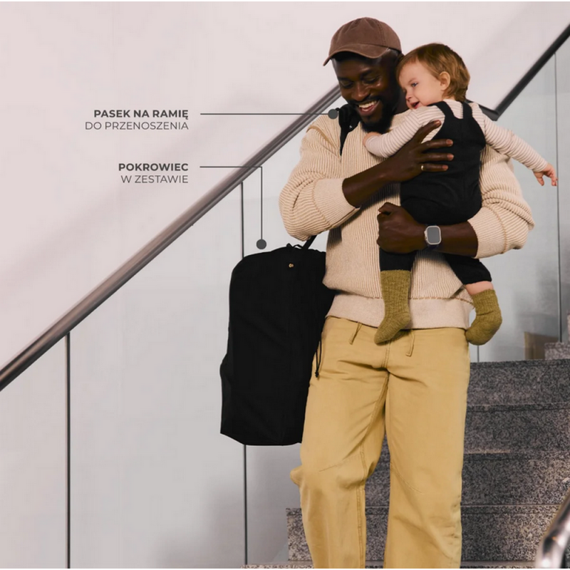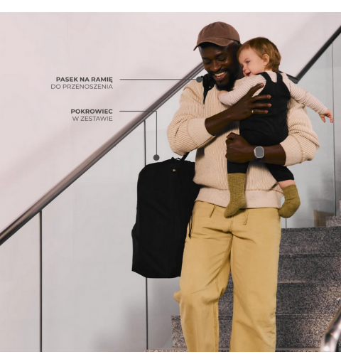 Wózek wyposażono w ochronny pokrowiec, który zabezpiecza go przed zabrudzeniami i uszkodzeniami podczas transportu. Pasek na ramię jest na stałe przymocowany do wózka i można go zapiąć pod spodem, gdy nie jest używany, co zapobiega jego przeszkadzaniu w trakcie jazdy.