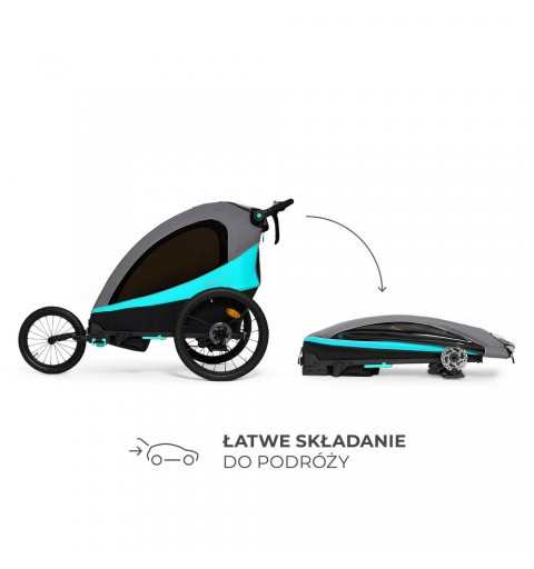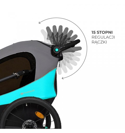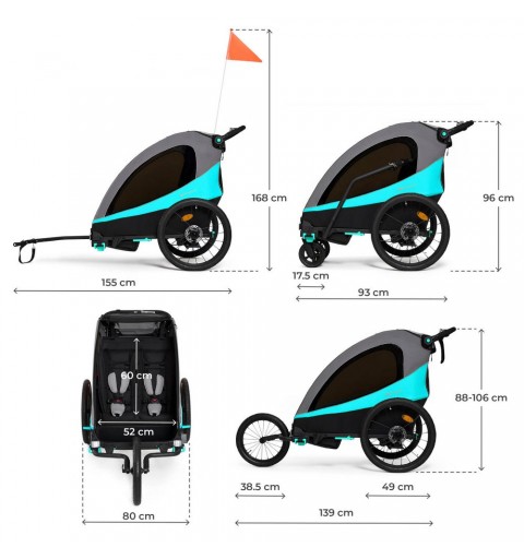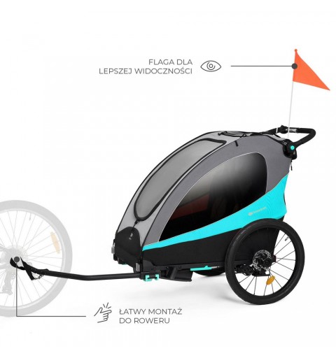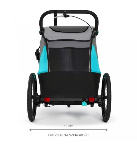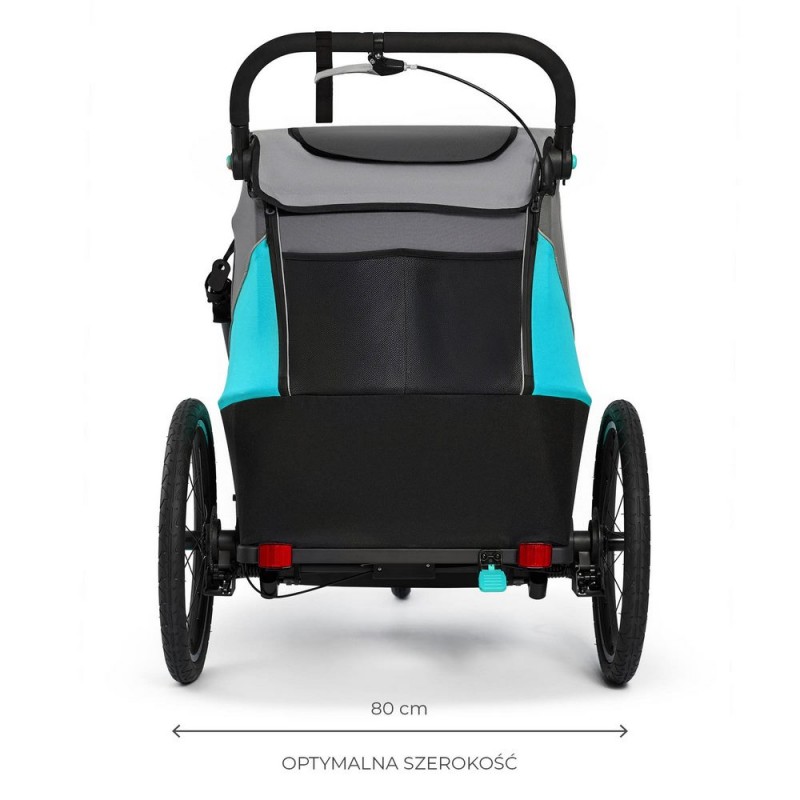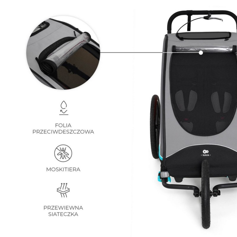 To komfortowa i wytrzymała przyczepka, która przeznaczona jest do przewozu dwójki dzieci lub dziecka i bagażu, do wagi w sumie 44 kg. Wyposażona w osłonę przeciwdeszczową, moskitierę, chorągiewkę i wiele innych przydatnych elementów zapewniających bezpieczeństwo i wygodę. Przyczepka rozkłada się w prosty sposób do transportu.
