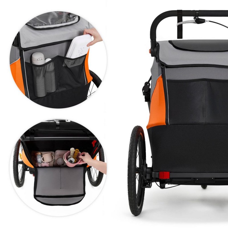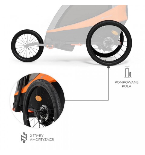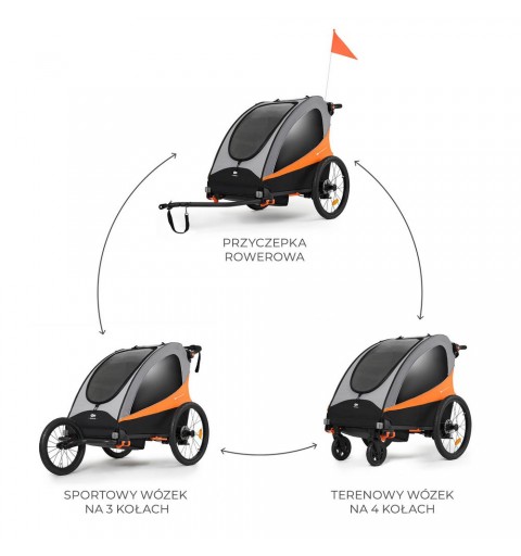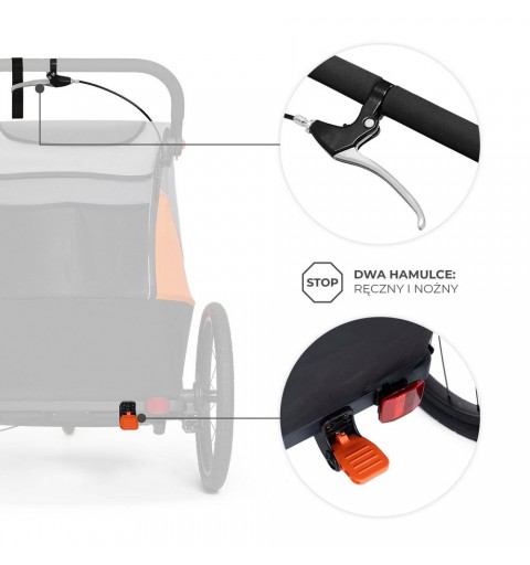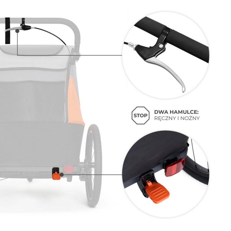 3w1: przyczepka rowerowa, wózek spacerowy i wózek do biegania Przyczepka rowerowa z hamulcami tarczowymi, która w szybki i prosty sposób zmienić się może w profesjonalny wózek biegowy i wózek spacerowy dwa dwójki dzieci.