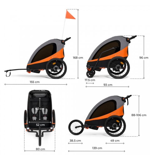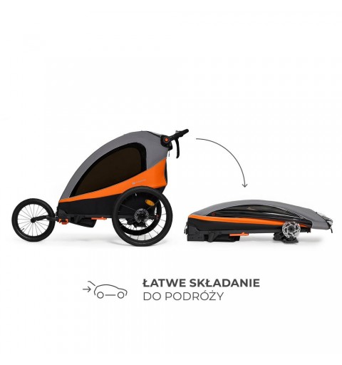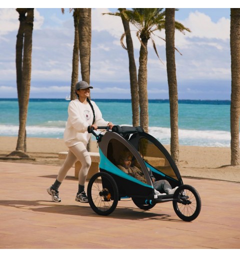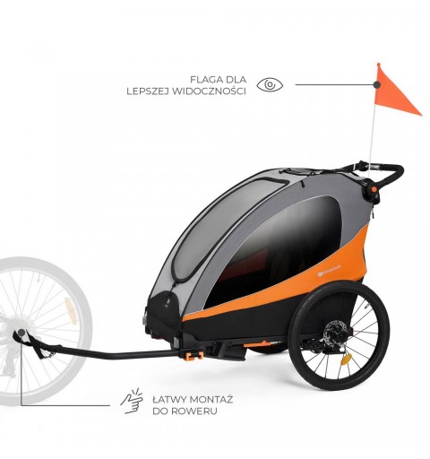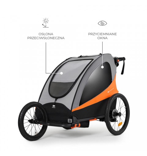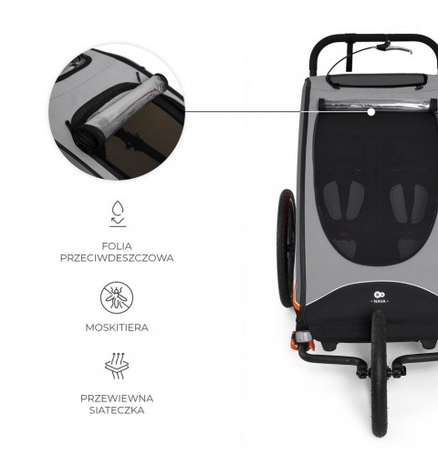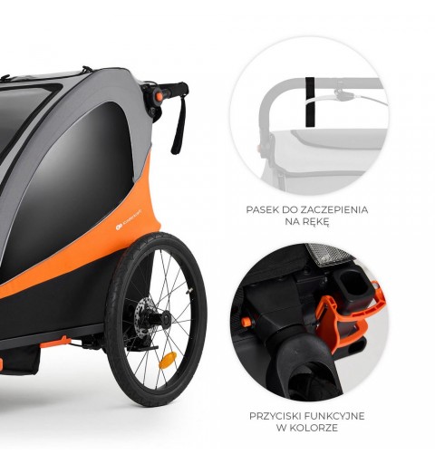 To komfortowa i wytrzymała przyczepka, która przeznaczona jest do przewozu dwójki dzieci lub dziecka i bagażu, do wagi w sumie 44 kg. Wyposażona w osłonę przeciwdeszczową, moskitierę, chorągiewkę i wiele innych przydatnych elementów zapewniających bezpieczeństwo i wygodę. Przyczepka rozkłada się w prosty sposób do transportu.