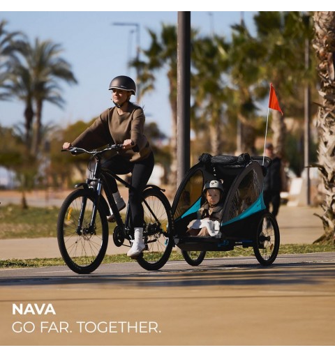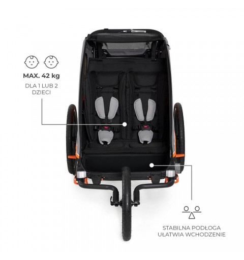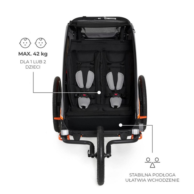 Z NAVA możesz zabrać na wyprawę jedno dziecko lub dwójkę maluchów (maksymalne obciążenie przy dwójce dzieci to aż 42,5 kg!) – każdy z pasażerów ma do dyspozycji wygodne miejsce z pasami bezpieczeństwa i zagłówkiem. Usztywniona, solidna podłoga umożliwia dzieciom samodzielne wchodzenie i wychodzenie z wózka – bez konieczności pomocy rodzica. To wygoda i niezależność w jednym.