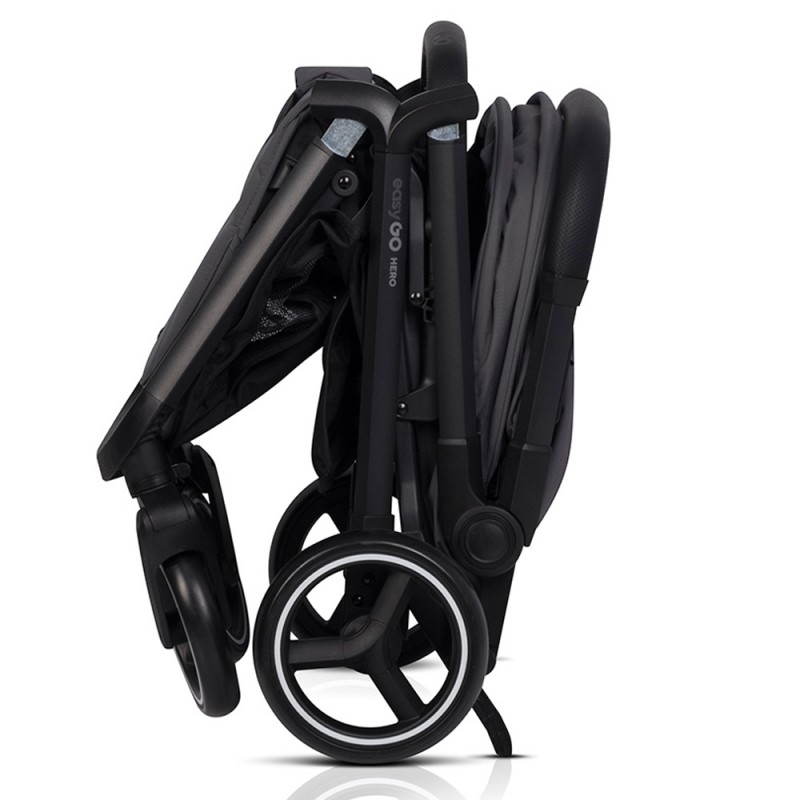 EASYGO Hero w wersji spacerowej to dziecięcy wózek, który posiada funkcję automatycznego składania. Wystarczy, że zwolnisz dźwignię umieszczoną na rączce, a wózek sam się złoży do pozycji samodzielnie stojącej. Po złożeniu będziesz miał łatwy dostęp do barierki, która jednocześnie służy jako uchwyt do przenoszenia. Dzięki temu systemowi składania Hero jest doskonałym wyborem dla aktywnych rodziców, którzy często muszą go składać i przewozić w pojeździe.