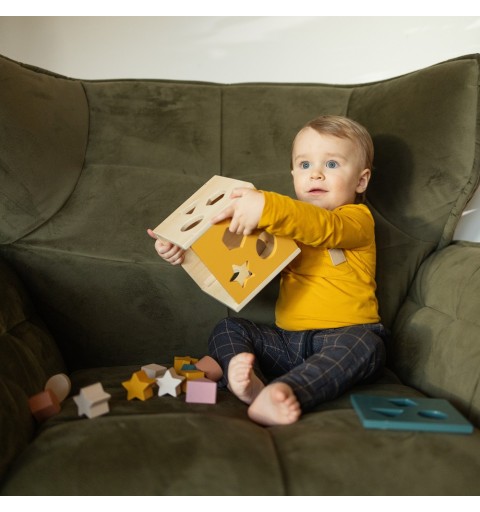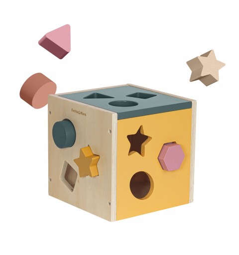 Zestaw zawiera drewnianą kostkę z czterema ściankami do sortowania oraz 12 kolorowych klocków o różnych kształtach, takich jak trójkąt, gwiazdka, kwadrat, romb czy koło.