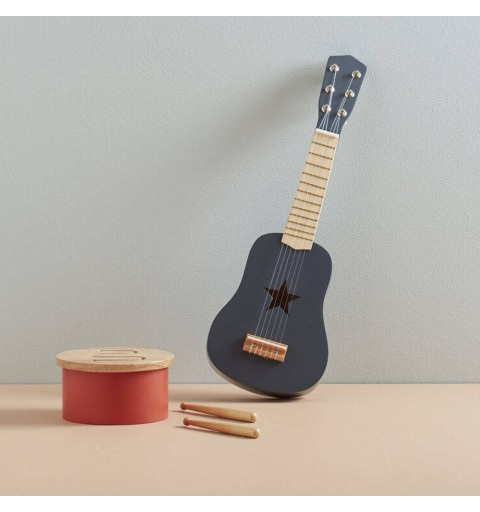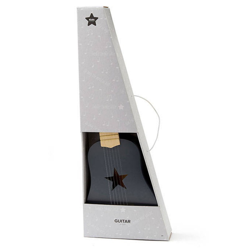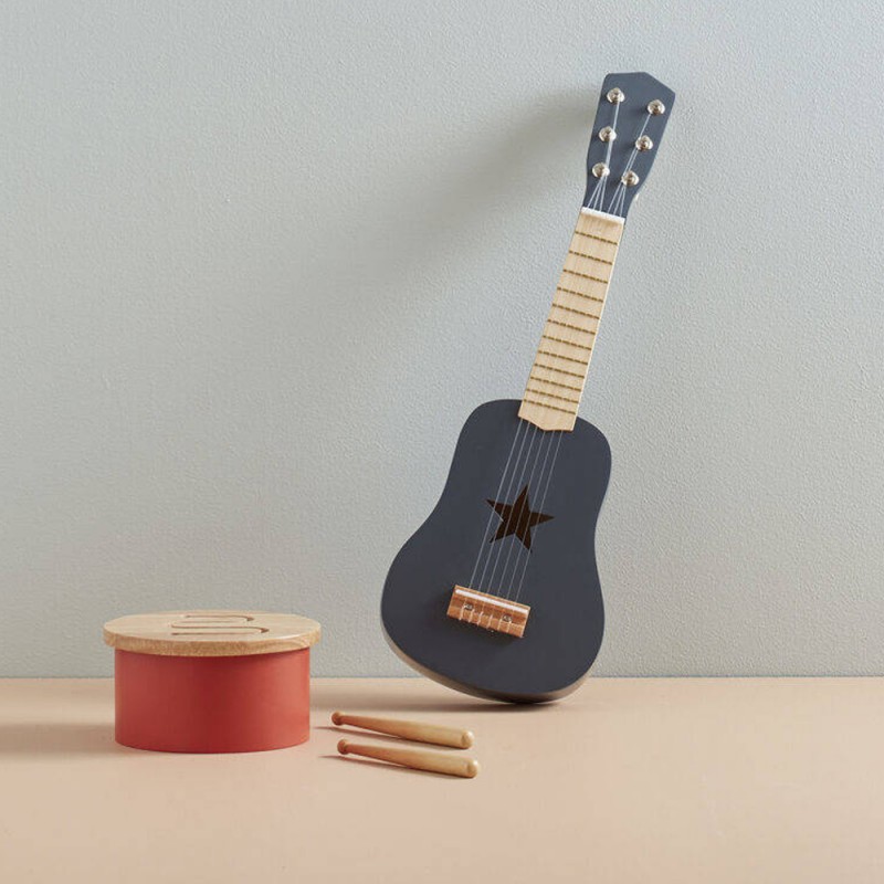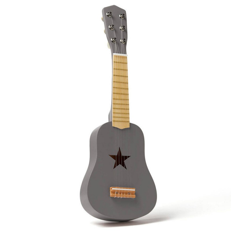 Drewniana gitara zabawkowa z wycięciem w kształcie gwiazdy.