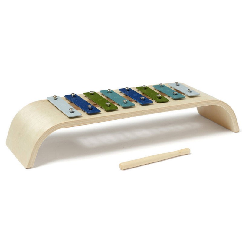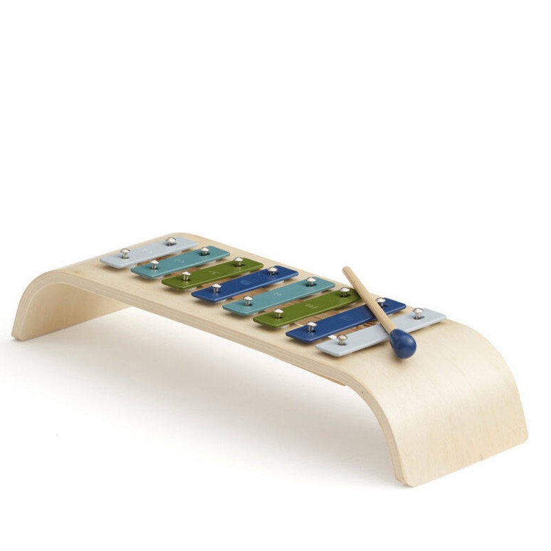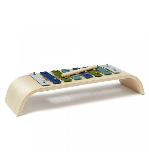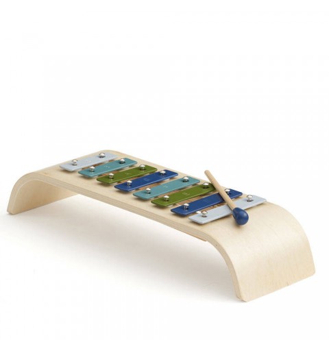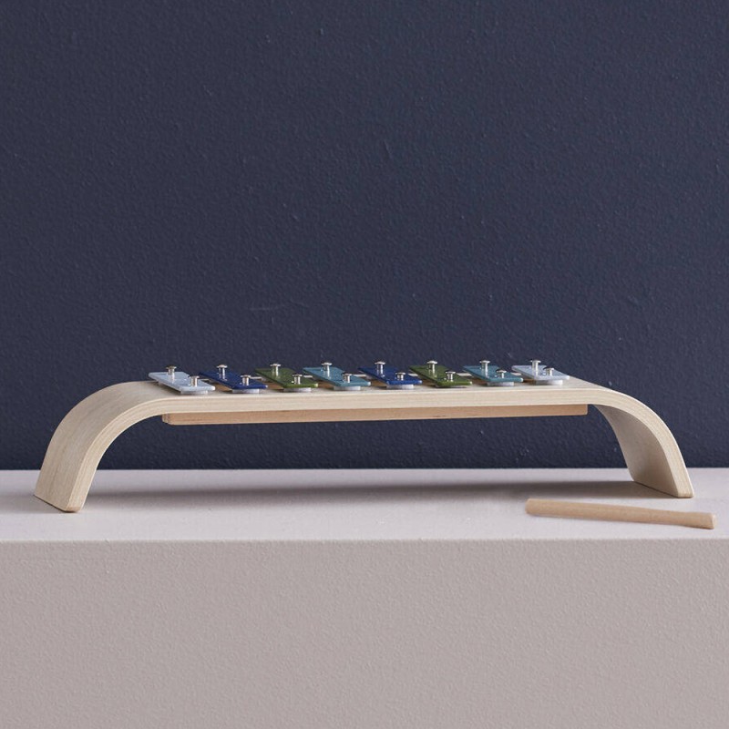 Zabawkowy ksylofon ze sklejki bejcowanej naturalnie z kolorowymi płytkami.