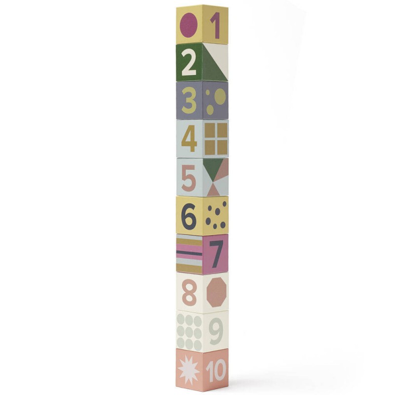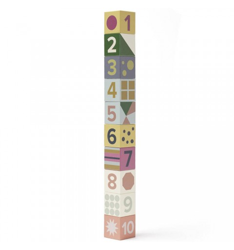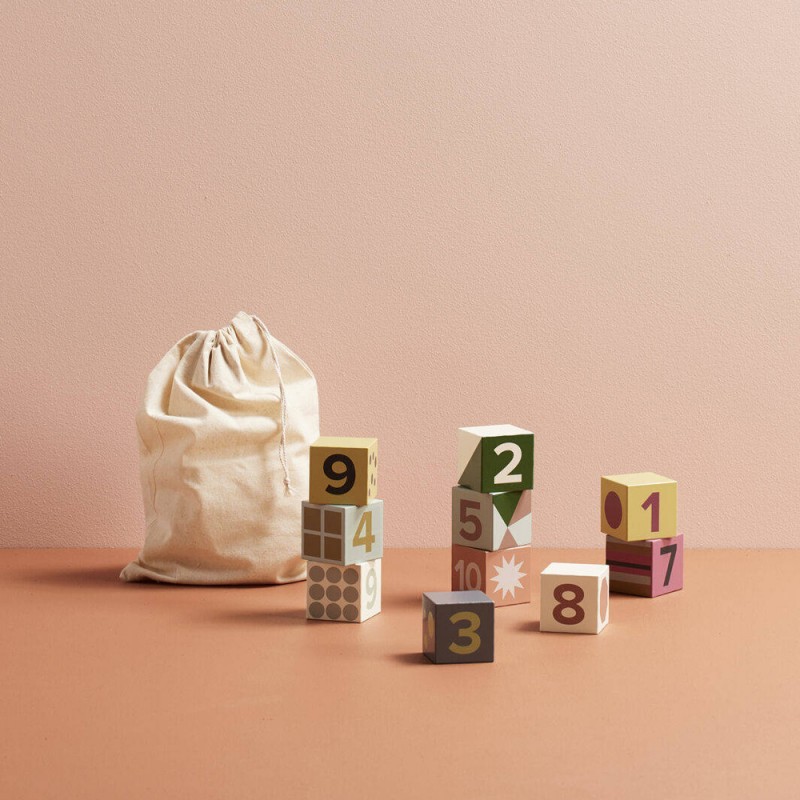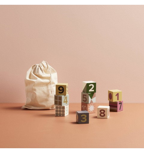 10 drewnianych klocków w wesołych kolorach. Klocki są ponumerowane (od 1 do 10) i oznaczone odpowiednimi symbolami po bokach. Klocek z cyfrą 4 ma po bokach namalowane cztery prostokąty, klocek z cyfrą 8 – ośmiokąt. Natomiast klocek z cyfrą 7 ma siedem pasków. Klockami można się bawić na wiele sposobów, np. układać je lub budować z nich konstrukcje. Możesz je także wykorzystać do nauki liczenia, rozpoznawania cyfr i kształtów. W zestawie z klockami jest bawełniana torba do przechowywania.
