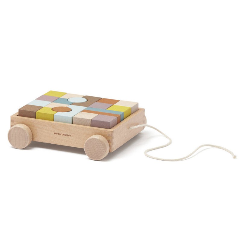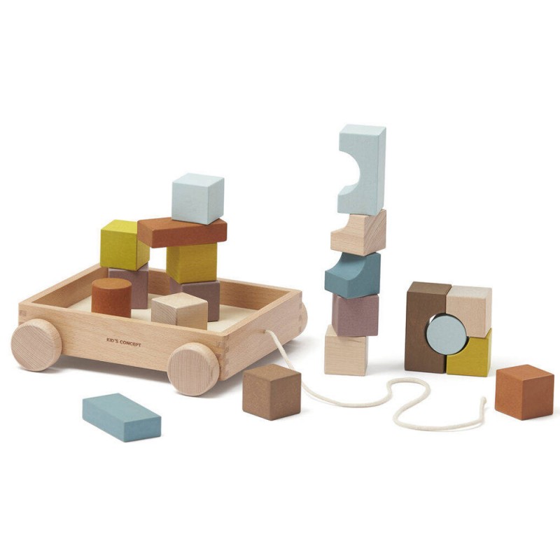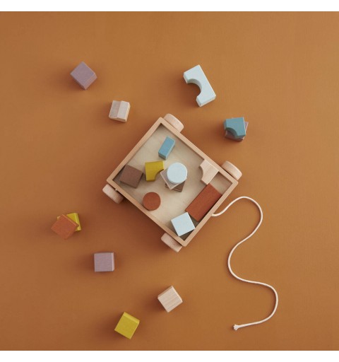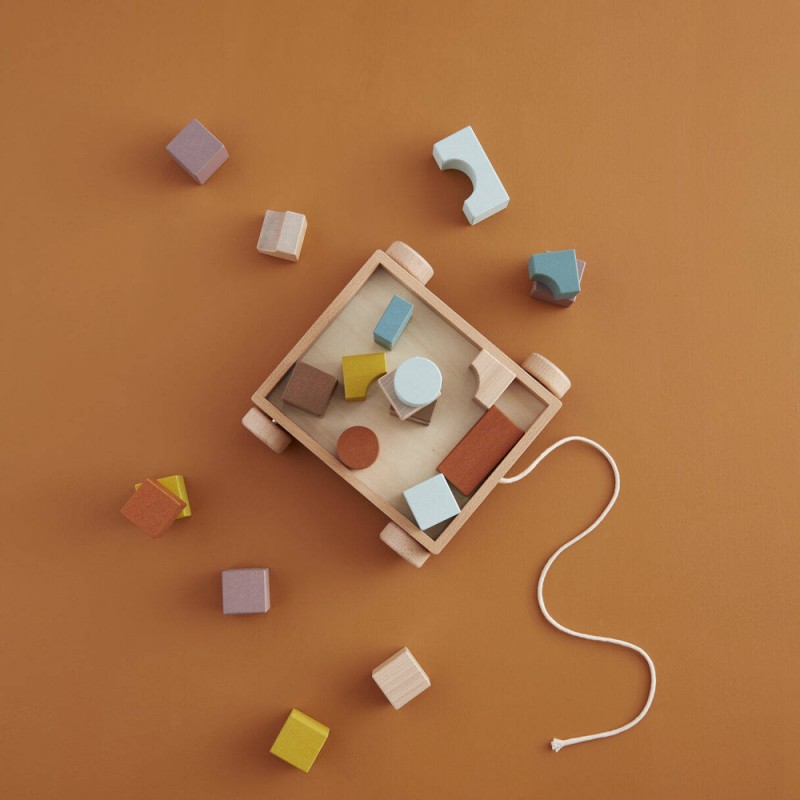 Wózek do ciągnięcia w kolorze naturalnego drewna z 20 bejcowanymi drewnianymi klockami to dwie klasyczne zabawki w jednym.