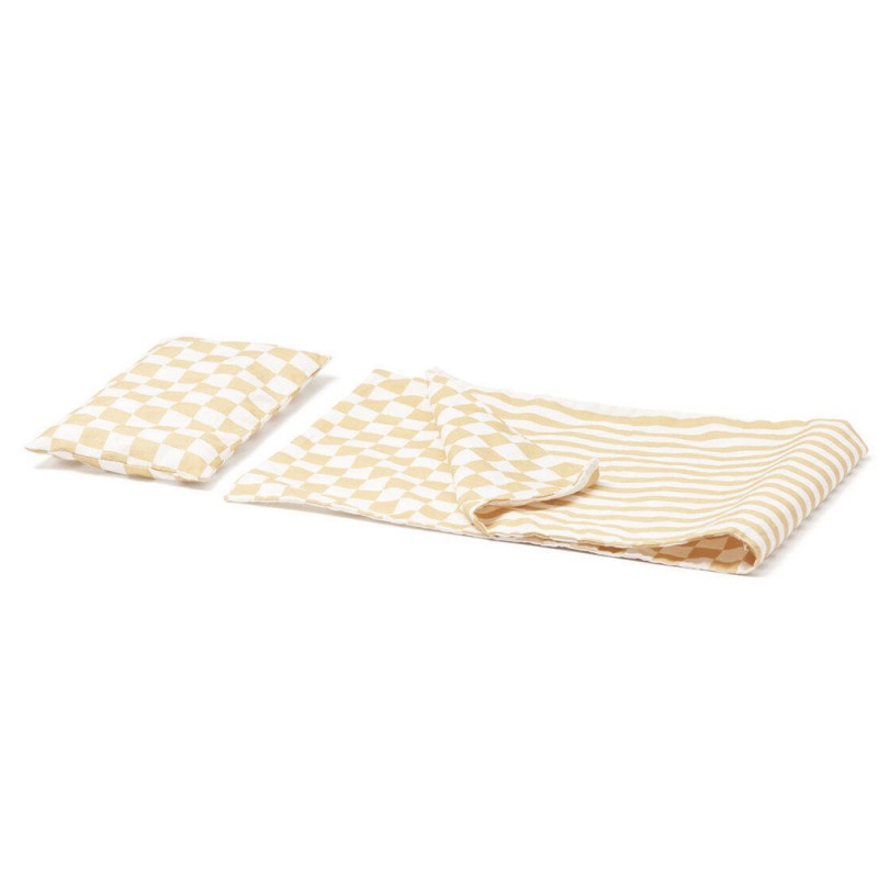 Części szczytowe łóżeczka ozdobione są czterolistnymi koniczynkami. Do łóżeczka dołączona jest bawełniana pościel z dwustronnym nadrukiem: poduszka oraz połączone ze sobą prześcieradło i kołdra. Paski i kratka zdobiące pościel zostały zaczerpnięte ze wzornictwa Carla i Karin Larssonów, dla których były to wzory bazowe. Natomiast motyw czterolistnej koniczynki pochodzi z malowideł ściennych w ich domu. Desenie na poduszce i kołdrze z prześcieradłem mają ten sam stonowany, neutralny żółty kolor. Każda ze stron pościeli ozdobiona jest innym wzorem: kratką lub paskami. Połączenie tych deseni daje przyjemny dla oka efekt. Czterolistna koniczynka jest częstą dekoracją ścian i mebli w willi Lilla Hyttnäs. Znajduje się tam nawet malowidło ścienne, na którym czwórka dzieci przedstawiona jest na tle czterolistnej koniczyny. Kompozycja ta tak nam się spodobała, że wybraliśmy ją na wizytówkę całej kolekcji. Wszak każdy wie, że czterolistna koniczyna przynosi szczęście temu, kto ją posiada! Lotta Hallenius, nasza projektantka, wspomina, że kształt czterolistnej koniczyny widziała na wielu dekoracjach w willi Lilla Hyttnäs, takich jak malowidła ścienne i haftowane detale. Tak więc ten kształt stał się graficznym symbolem naszej kolekcji Carla Larssona. Może on być symbolem rodziny z dziećmi – niezależnie od tego, jaka ona jest.