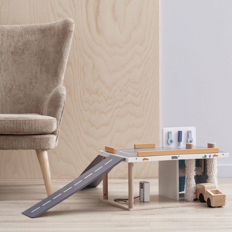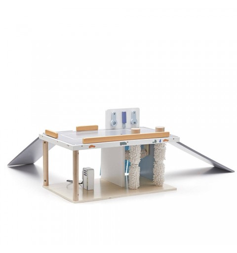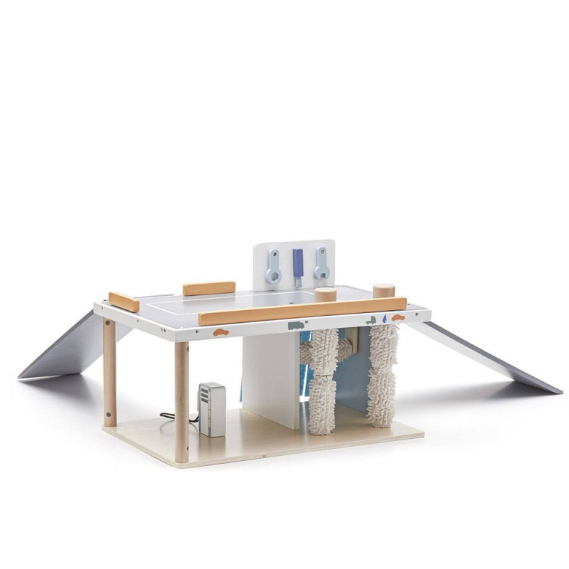 Napraw i umyj samochód, a potem napełnij zbiornik paliwa. Myjnia samochodowa ma obracające się wałki myjące z miękkimi szczotkami, dzięki czemu wygląda realistycznie. W zestawie są także trzy małe narzędzia do naprawy i dystrybutor paliwa. Samochody mają otwór umożliwiający tankowanie.