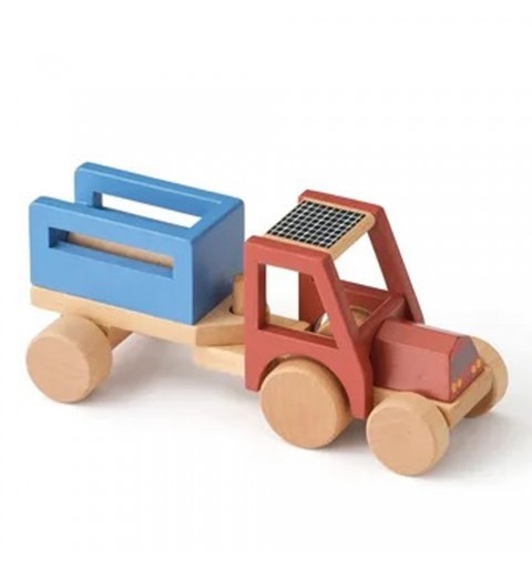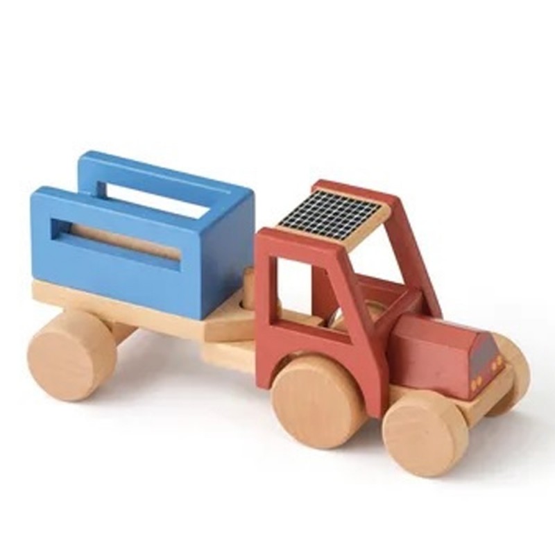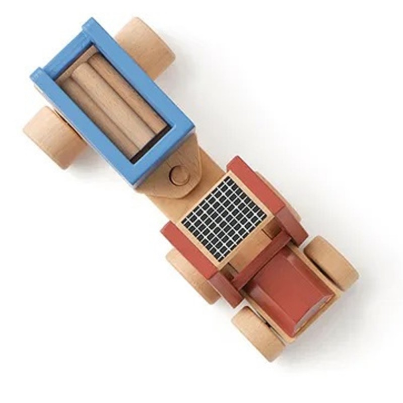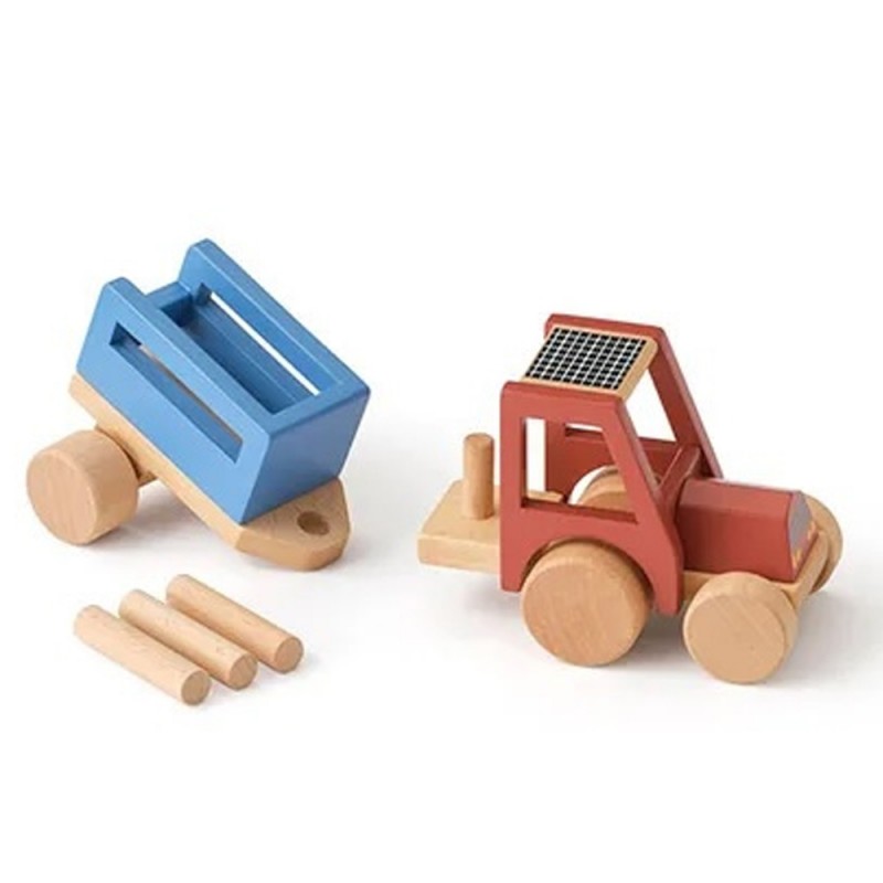 Drewniany traktor w rozmiarze idealnym dla małych dłoni. Traktor z przyczepką, w której zmieścił trzy drewniane kłody - to wspaniały pomysł na załadunek i rozładunek.
