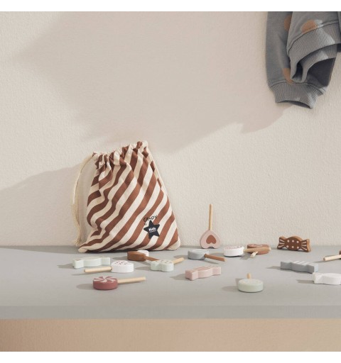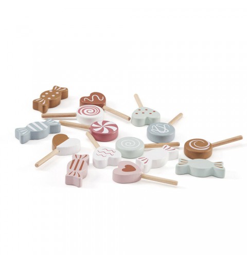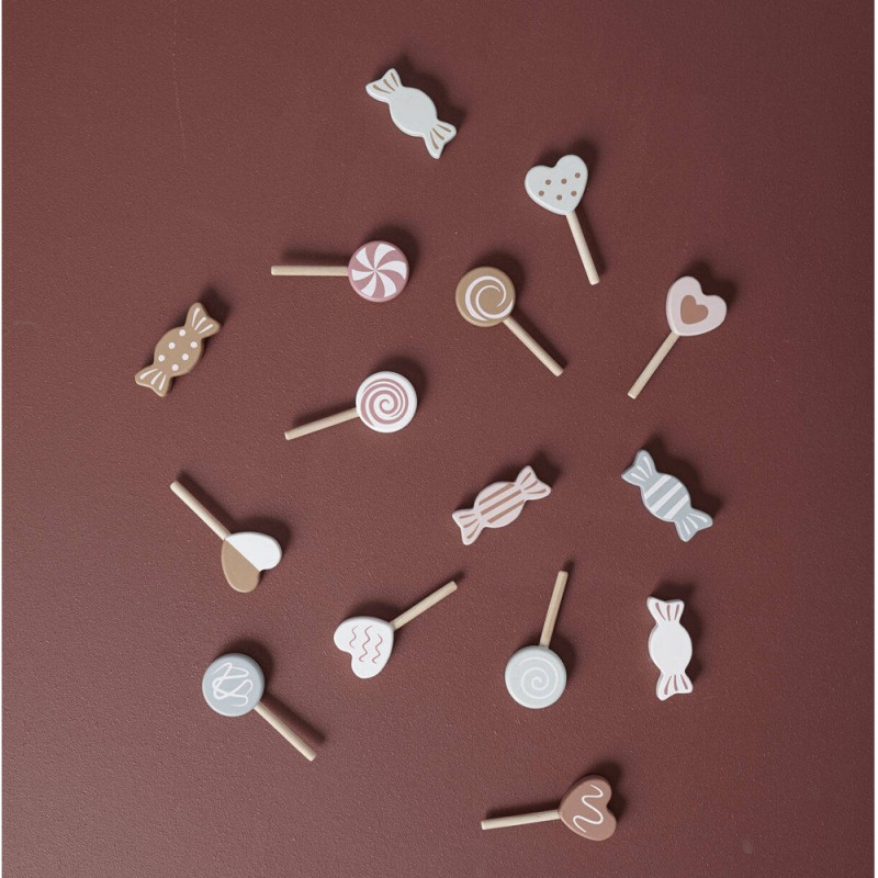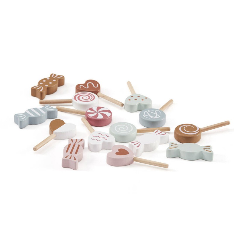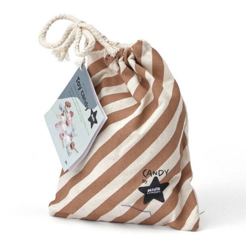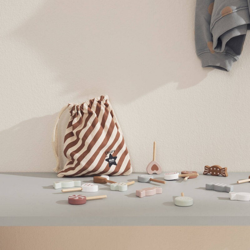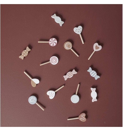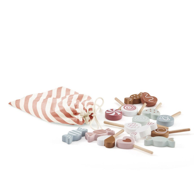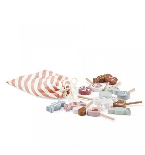 Cukierki do zabawy, wykonane z drewna. Zestaw zawiera 15 cukierków i torbę do przechowywania o wymiarach 15 x 20 cm.