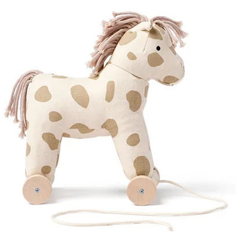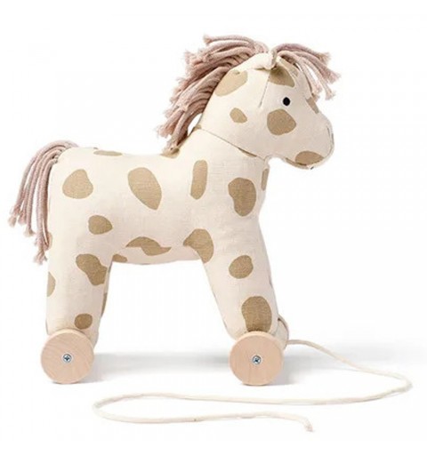 Dotty to uroczy koń na sznurku wykonany z trwałego płótna bawełnianego w kropki. Miękka grzywa i ogon z włóczki czynią go idealnym zarówno do aktywnej zabawy, jak i przytulania. Sznurek ułatwia prowadzenie konika podczas spacerów, wspierając rozwój równowagi i koordynacji. Po zdjęciu kółek Dotty zamienia się w miękką przytulankę na spokojniejsze chwile lub zabawę w udawanie. Jej kompaktowy rozmiar sprawia, że łatwo zabrać ją w podróż lub ustawić na półce, gdy zabawa się skończy.
