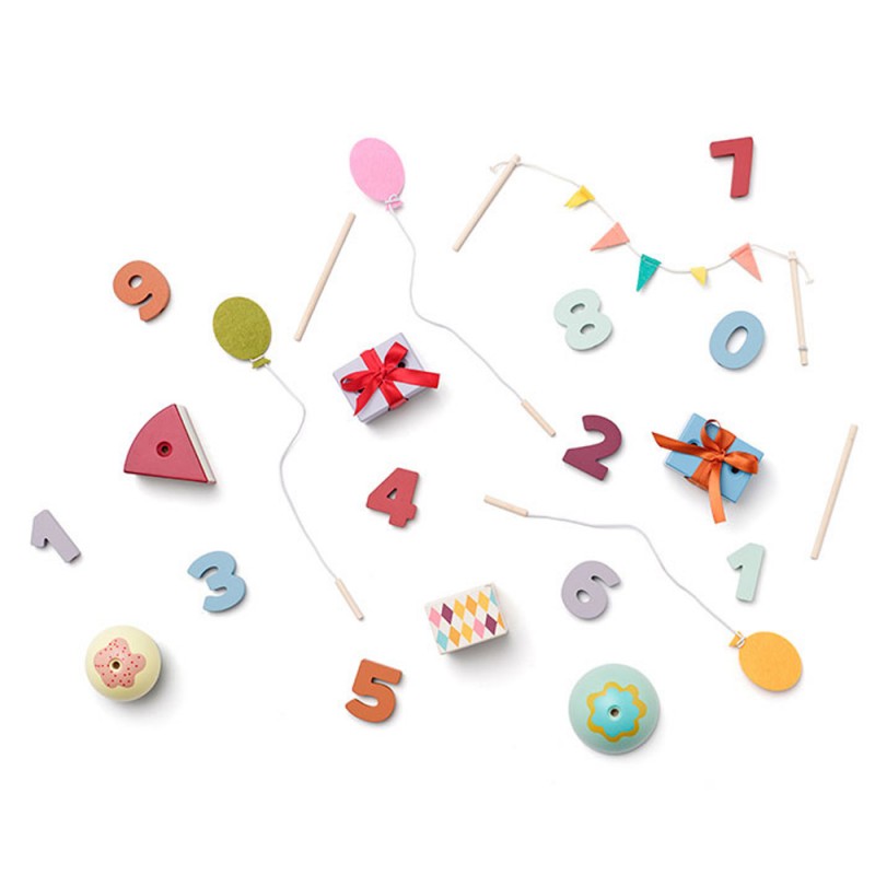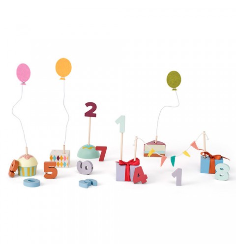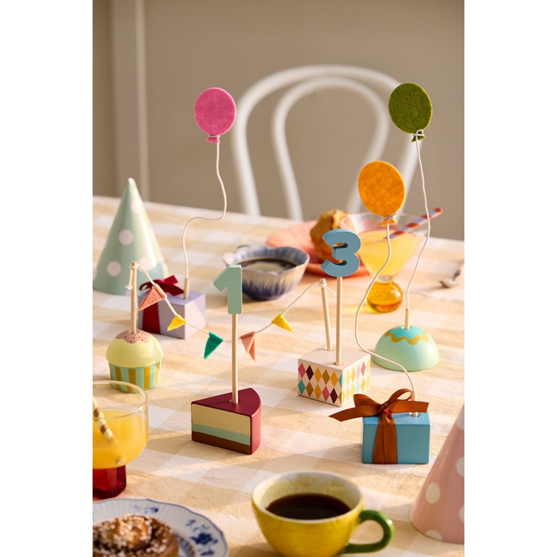 W komplecie drewniane cyfry od 0 do 9 oraz dodatkowa cyfra 1, dzięki czemu zestaw posłuży na wiele kolejnych lat świętowania. Dwa filcowe baloniki na metalowych drucikach dodają całości lekkości i uroku.